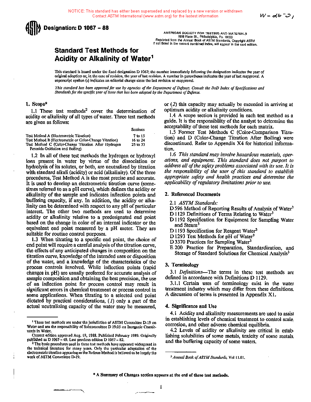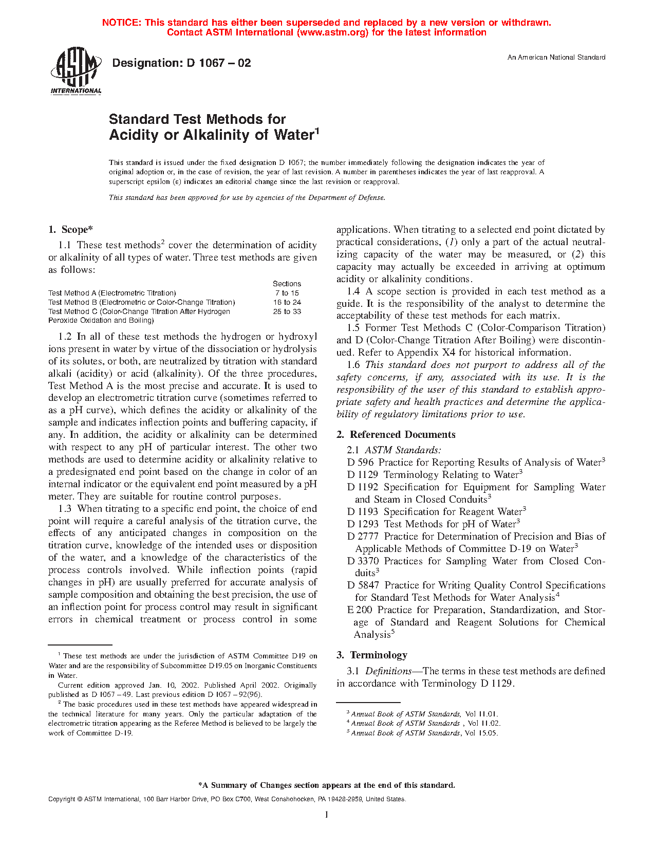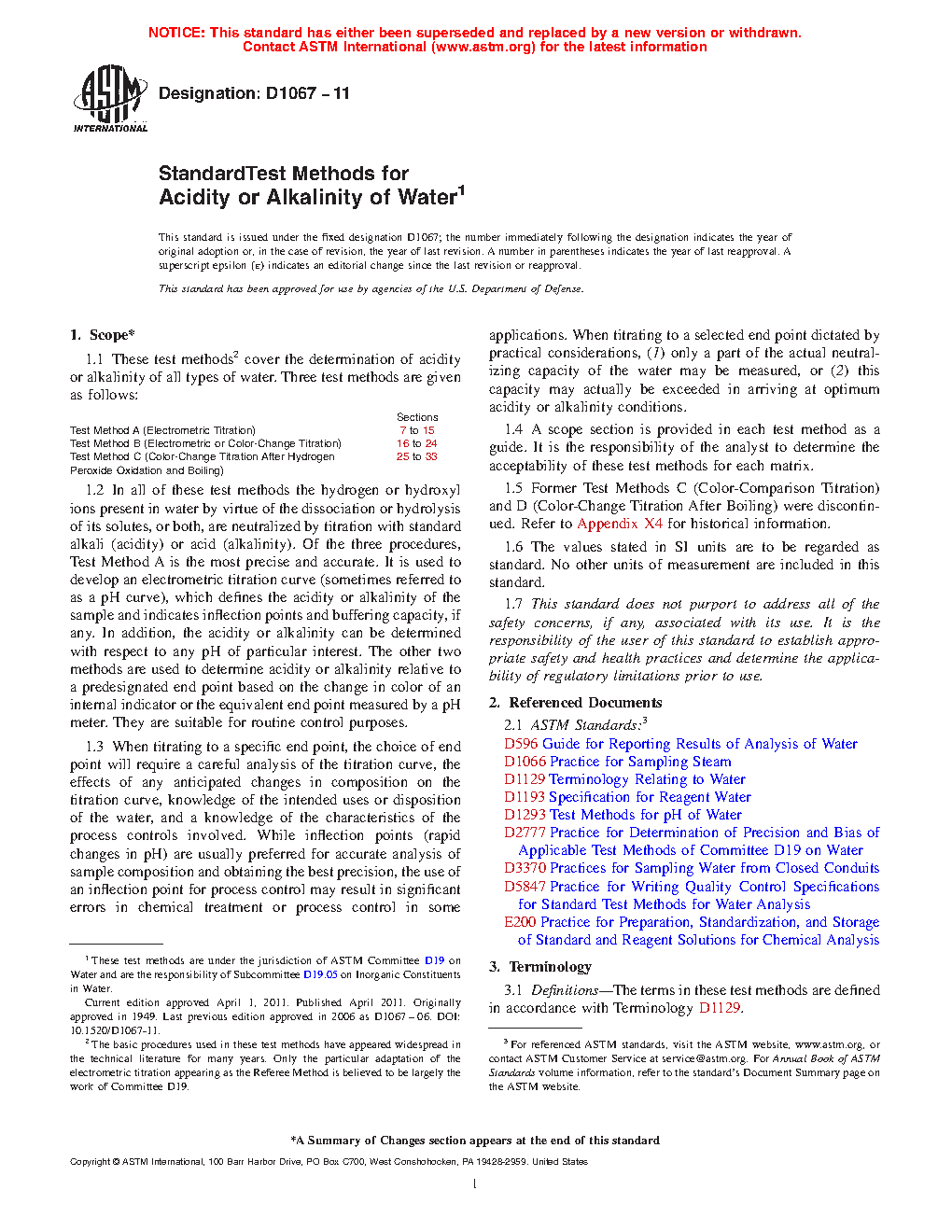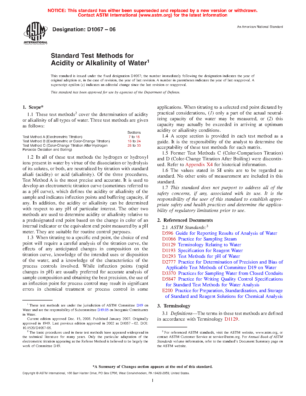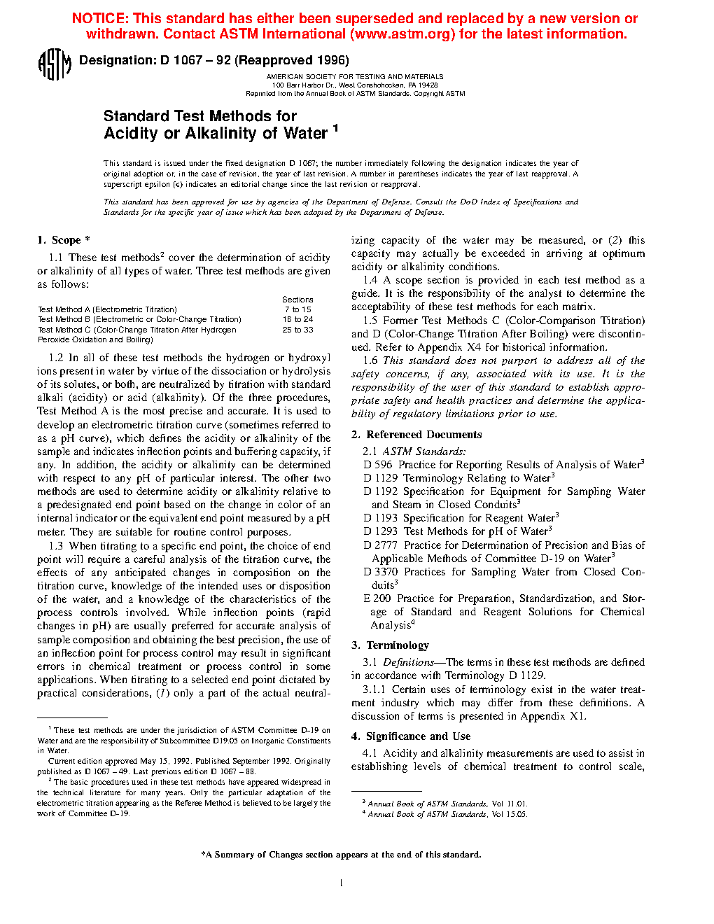 1.5 Former Test Methods C (Color-Comparison Titration) and D (Color-Change Titration After Boiling) were discontinued. Refer to Appendix X4 for historical information.