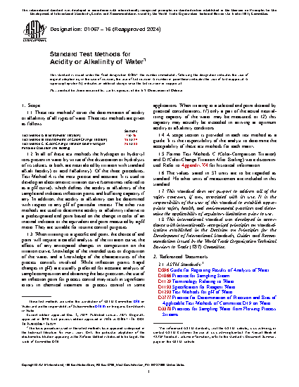 1.1 These test methods2 cover the determination of acidity or alkalinity of all types of water. Three test methods are given as follows: