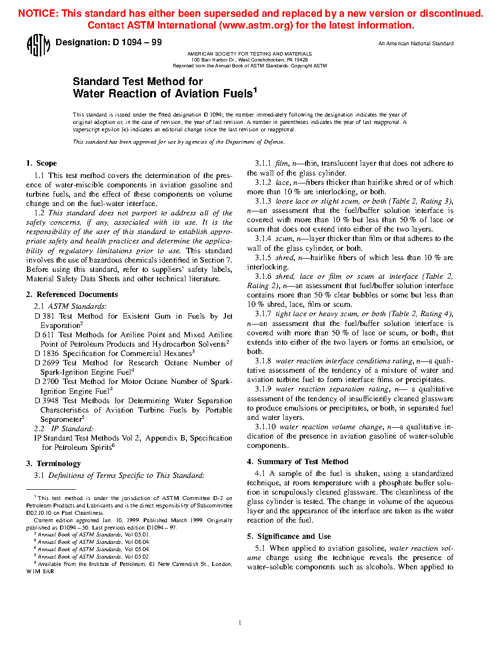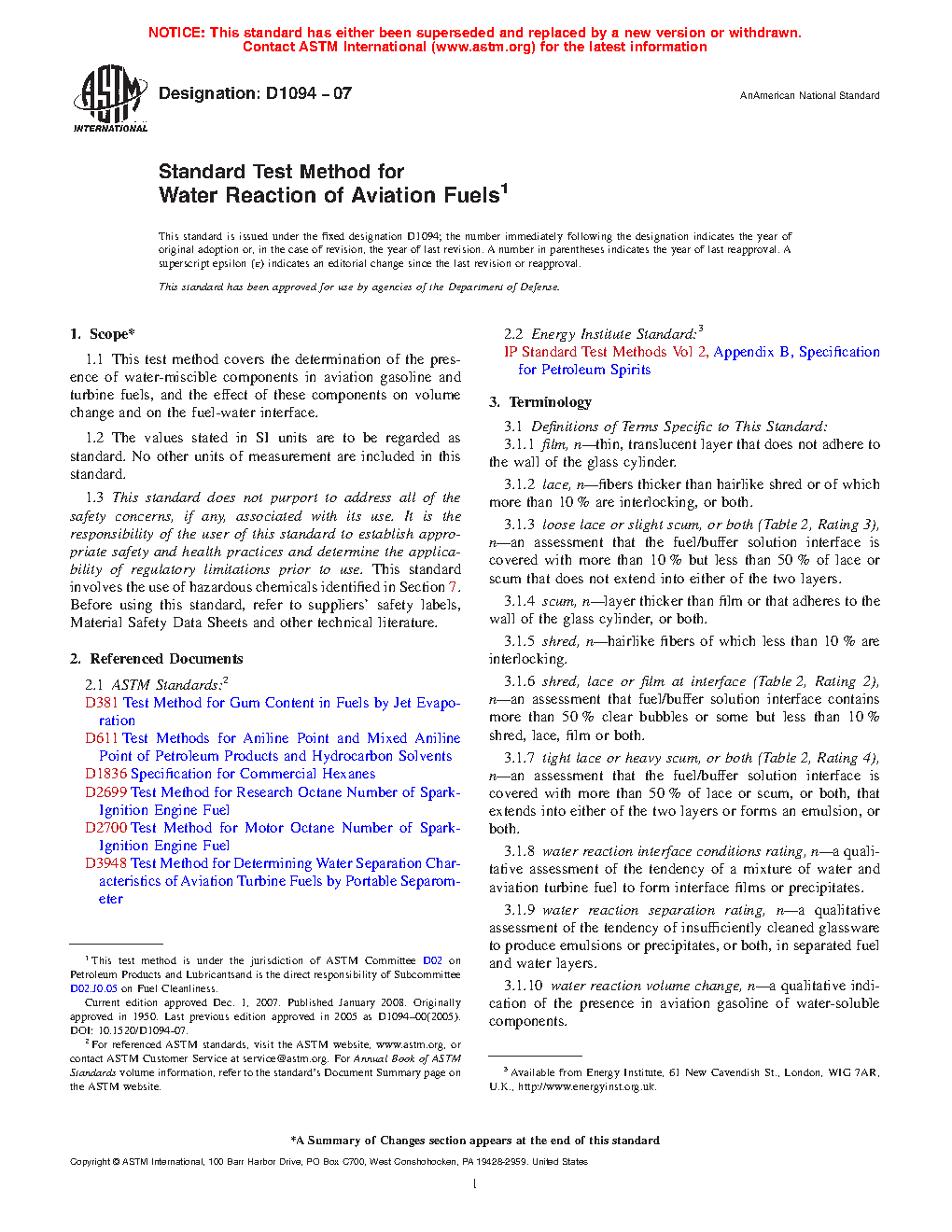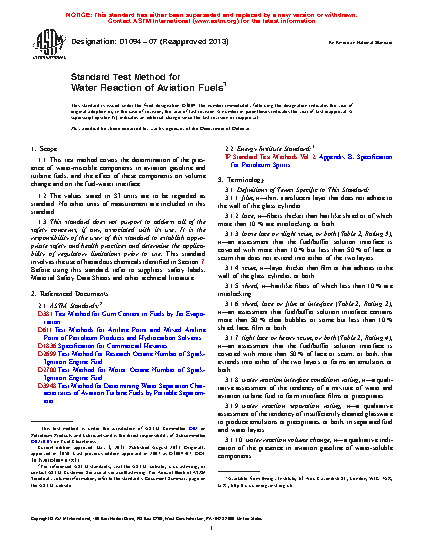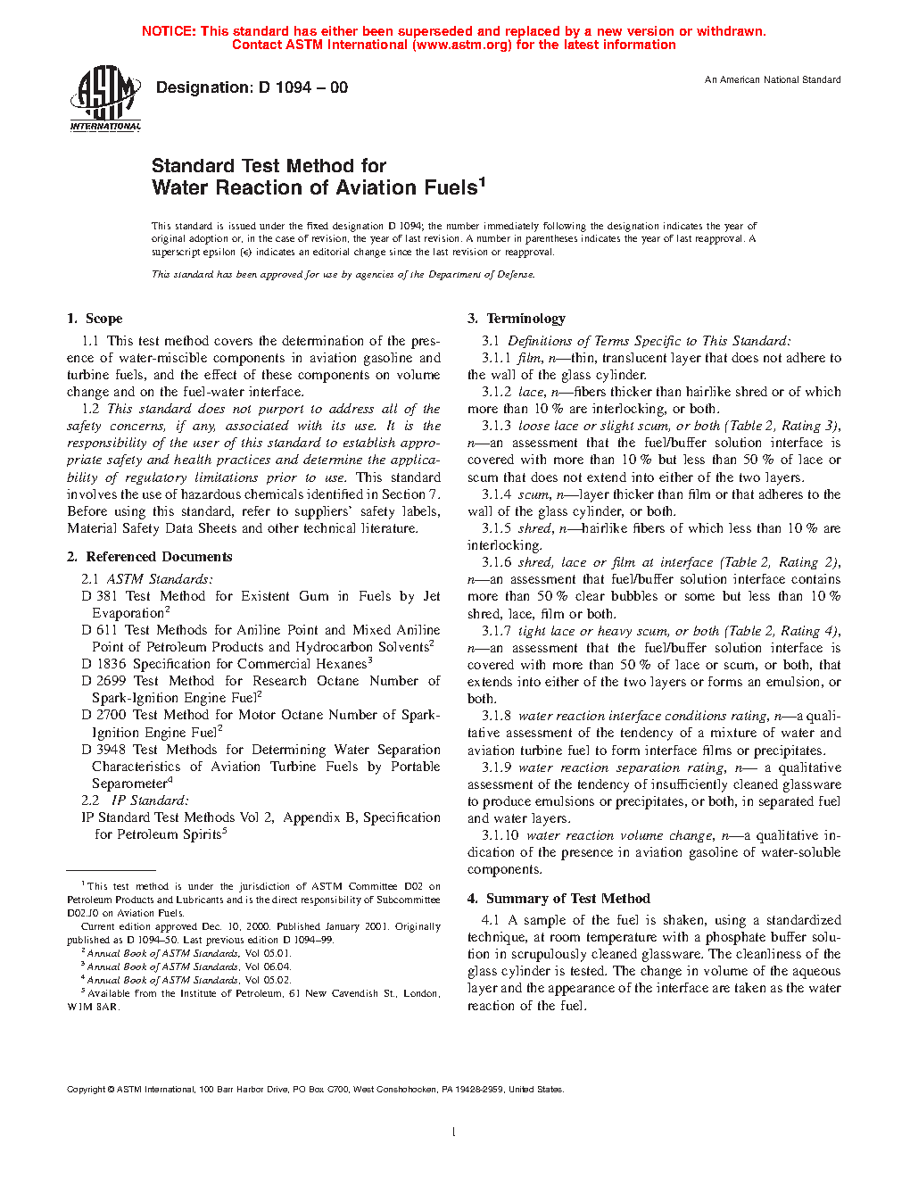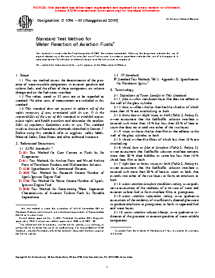 5.1 When applied to aviation gasoline, water reaction volume change using the technique reveals the presence of water–soluble components such as alcohols. When applied to aviation turbine fuels, water reaction interface rating using the technique is not reliable in revealing the presence of surfactants which disarm filter-separators quickly and allow free water and particulates to pass; but can reveal the presence of other types of contaminants. Other tests, such as Test Method D3948, are capable of detecting surfactants in aviation fuels.