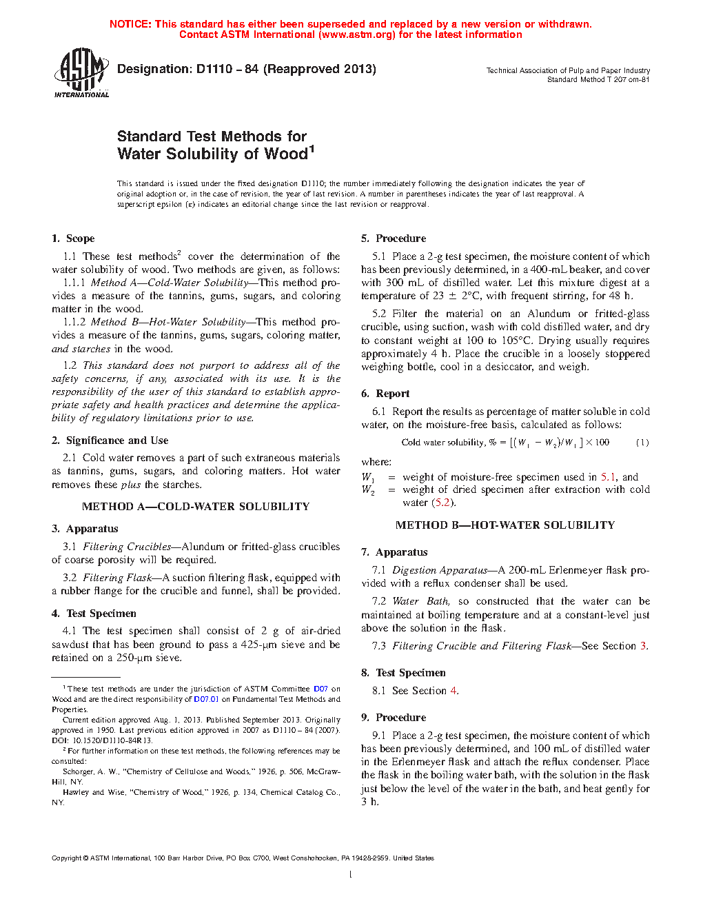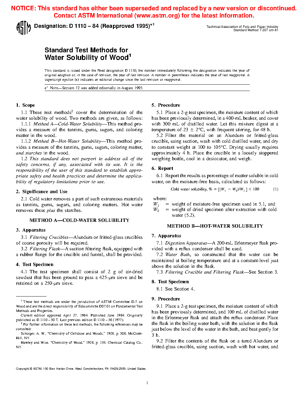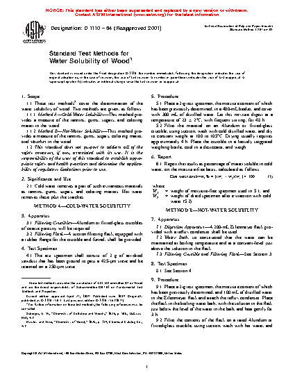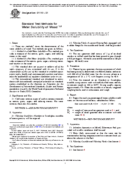 1.1 These test methods2 cover the determination of the water solubility of wood. Two methods are given, as follows: