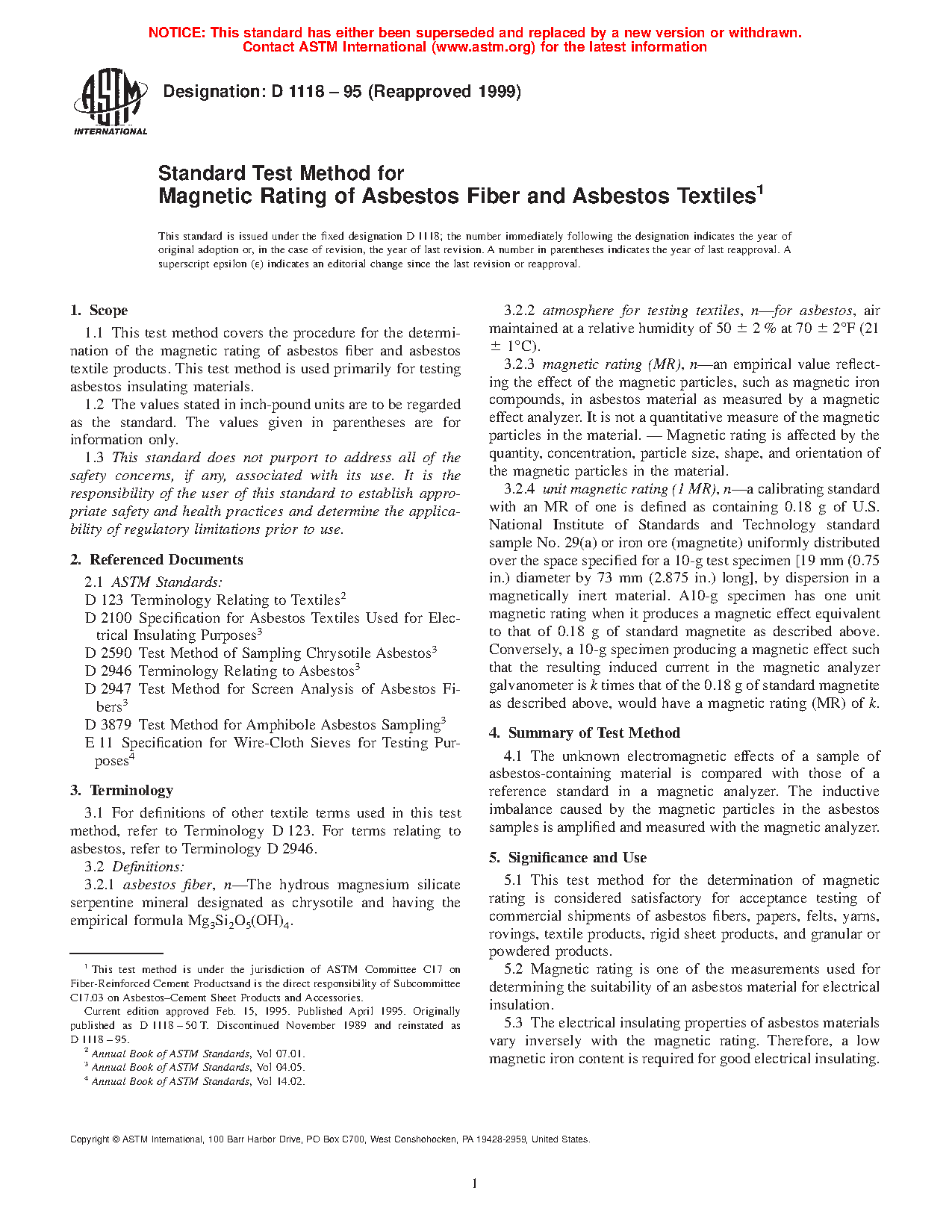 This test method for the determination of magnetic rating is considered satisfactory for acceptance testing of commercial shipments of asbestos fibers, papers, felts, yarns, rovings, textile products, rigid sheet products, and granular or powdered products.