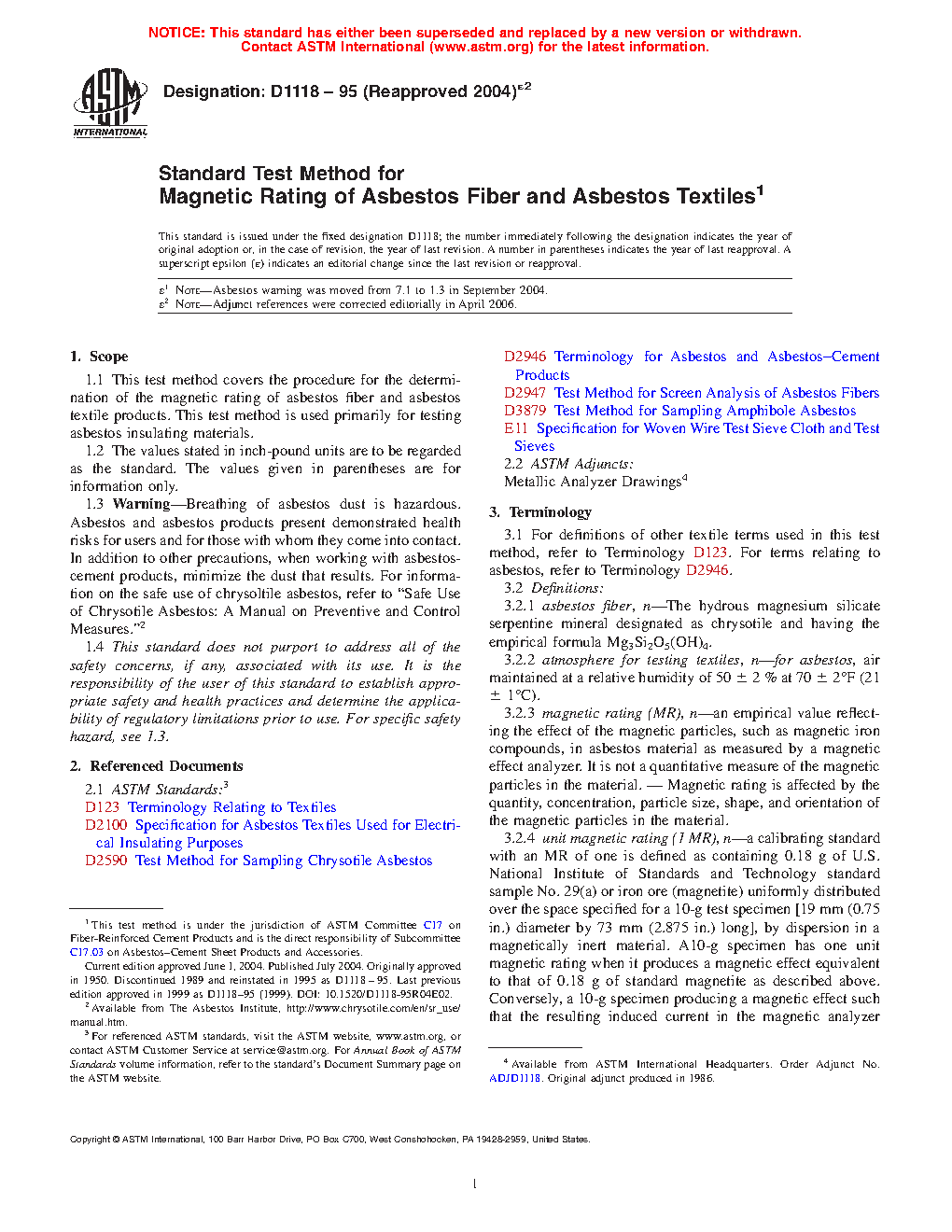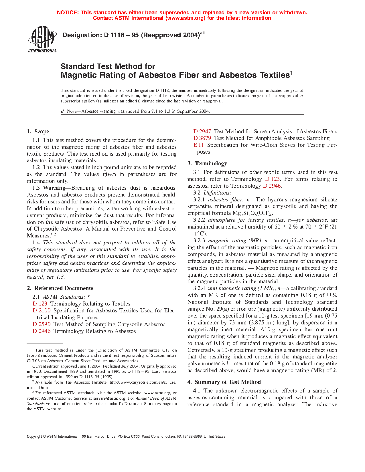 1.3 Warning-Breathing of asbestos dust is hazardous. Asbestos and asbestos products present demonstrated health risks for users and for those with whom they come into contact. In addition to other precautions, when working with asbestos-cement products, minimize the dust that results. For information on the safe use of chrysoltile asbestos, refer to "Safe Use of Chrysotile Asbestos: A Manual on Preventive and Control Measures."