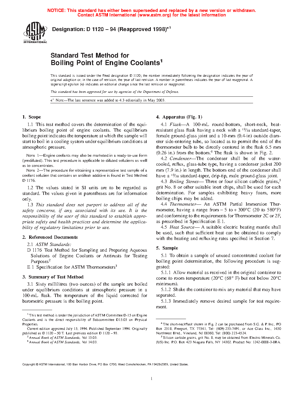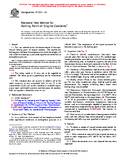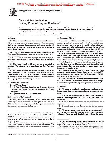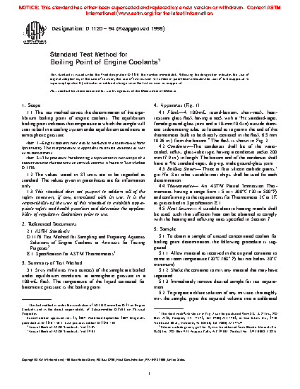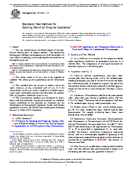 1.1 This test method covers the determination of the equilibrium boiling point of engine coolants. The equilibrium boiling point indicates the temperature at which the sample will start to boil in a cooling system under equilibrium conditions at atmospheric pressure.