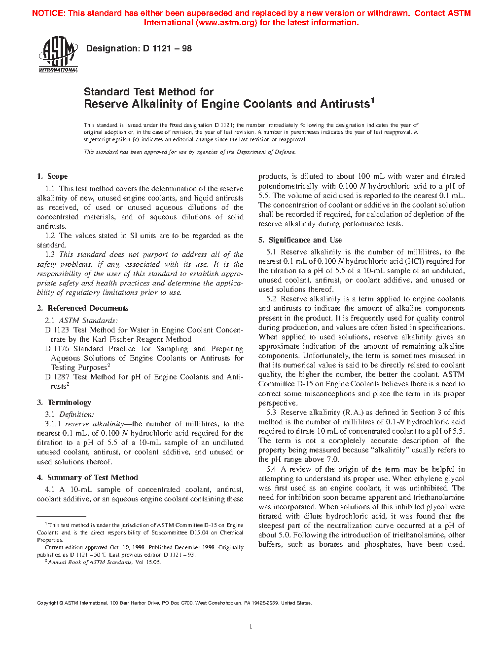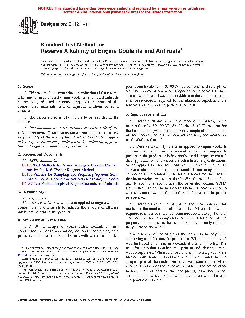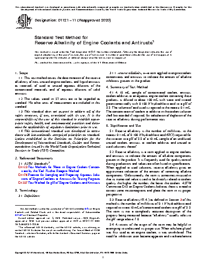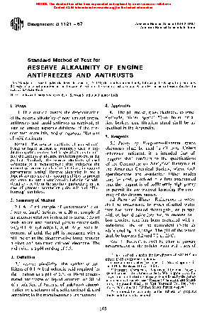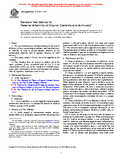 5.2 Reserve alkalinity is a term applied to engine coolants and antirusts to indicate the amount of alkaline components present in the product. It is frequently used for quality control during production, and values are often listed in specifications. When applied to used solutions, reserve alkalinity gives an approximate indication of the amount of remaining alkaline components. Unfortunately, the term is sometimes misused in that its numerical value is said to be directly related to coolant quality, the higher the number, the better the coolant. ASTM Committee D15 on Engine Coolants believes there is a need to correct some misconceptions and place the term in its proper perspective.