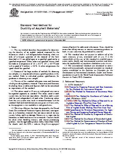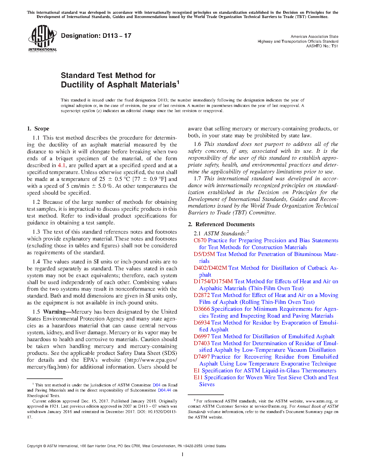 1.1 This test method describes the procedure for determining the ductility of an asphalt material measured by the distance to which it will elongate before breaking when two ends of a briquet specimen of the material of the form described in 4.1 are pulled apart at a specified speed and at a specified temperature. Unless otherwise specified, the test shall be made at a temperature of 25 ± 0.5 °C [77 ± 0.9 °F] and with a speed of 5 cm/min ± 5.0 %. At other temperatures the speed should be specified.