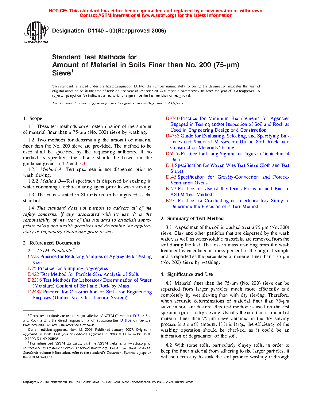 1.1 These test methods cover the determination of the amount of material finer than a 75-µm (No. 200) sieve by washing of material with a maximum particle size of 75 mm (3 in.).