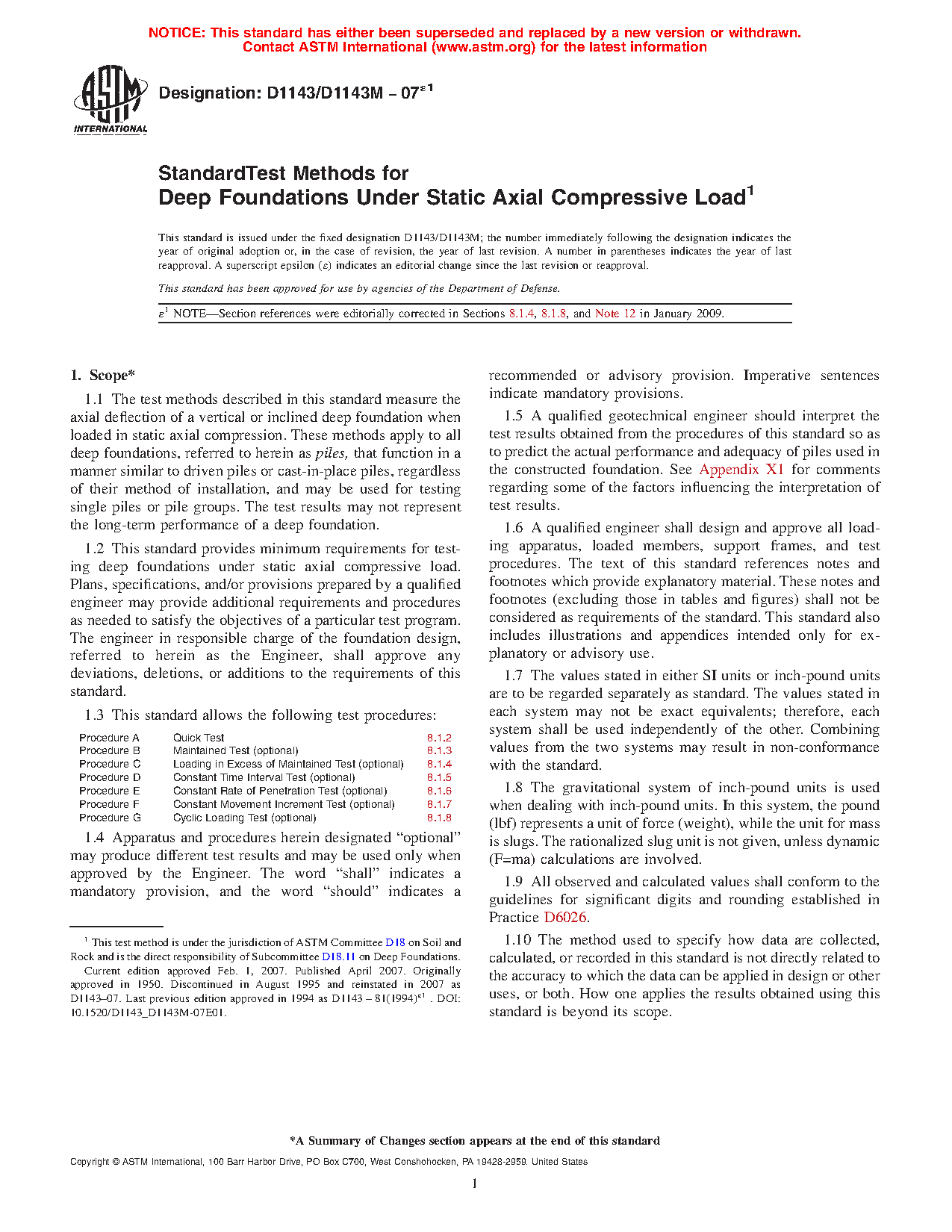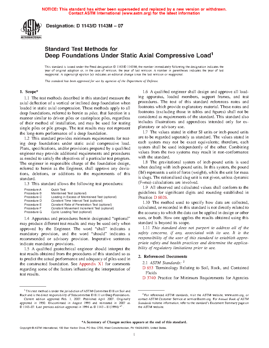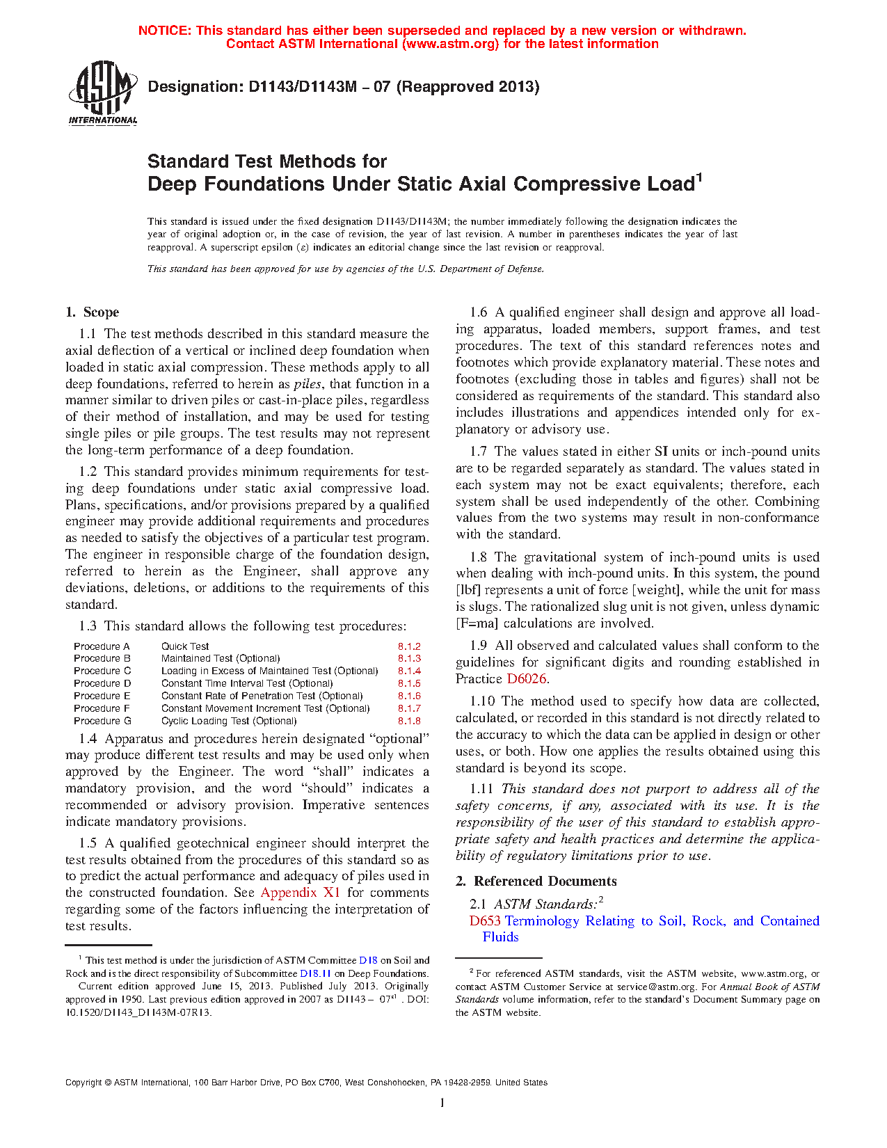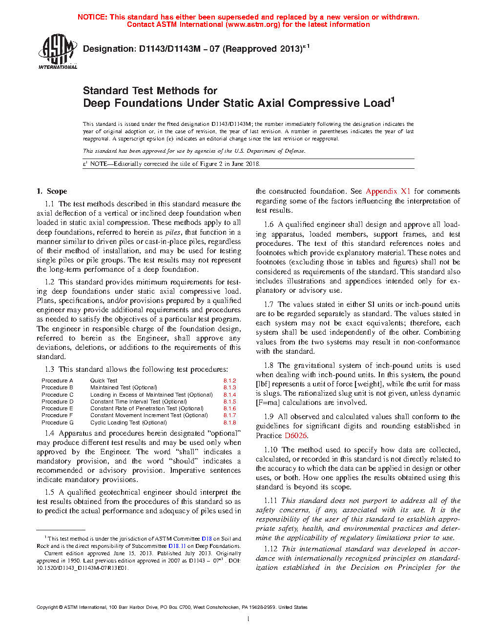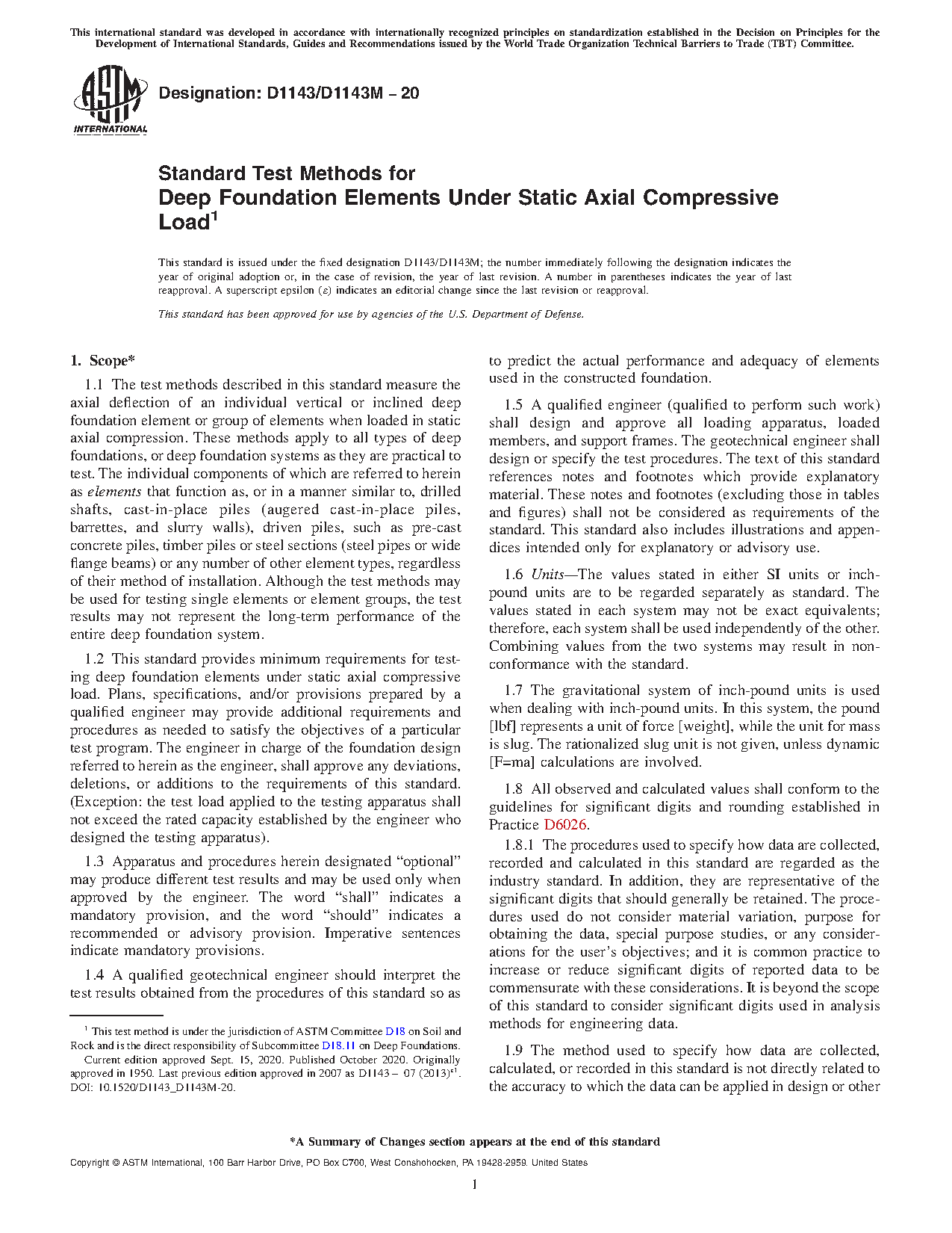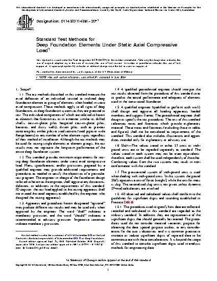 1.2 This standard provides minimum requirements for testing deep foundations under static axial compressive load. Plans, specifications, and/or provisions prepared by a qualified engineer may provide additional requirements and procedures as needed to satisfy the objectives of a particular test program. The engineer in responsible charge of the foundation design, referred to herein as the Engineer, shall approve any deviations, deletions, or additions to the requirements of this standard.