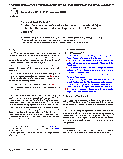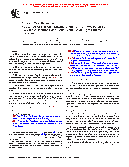 1.1 This test method describes a technique to evaluate the surface discoloration of white or light-colored vulcanized rubber, that may occur on exposure to heat and ultraviolet radiation.