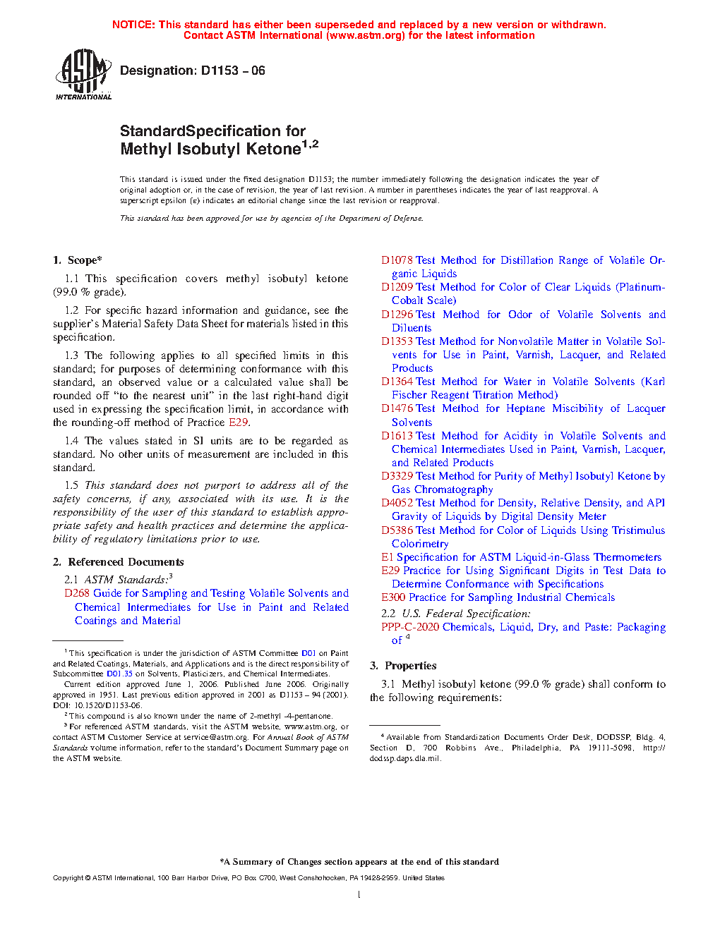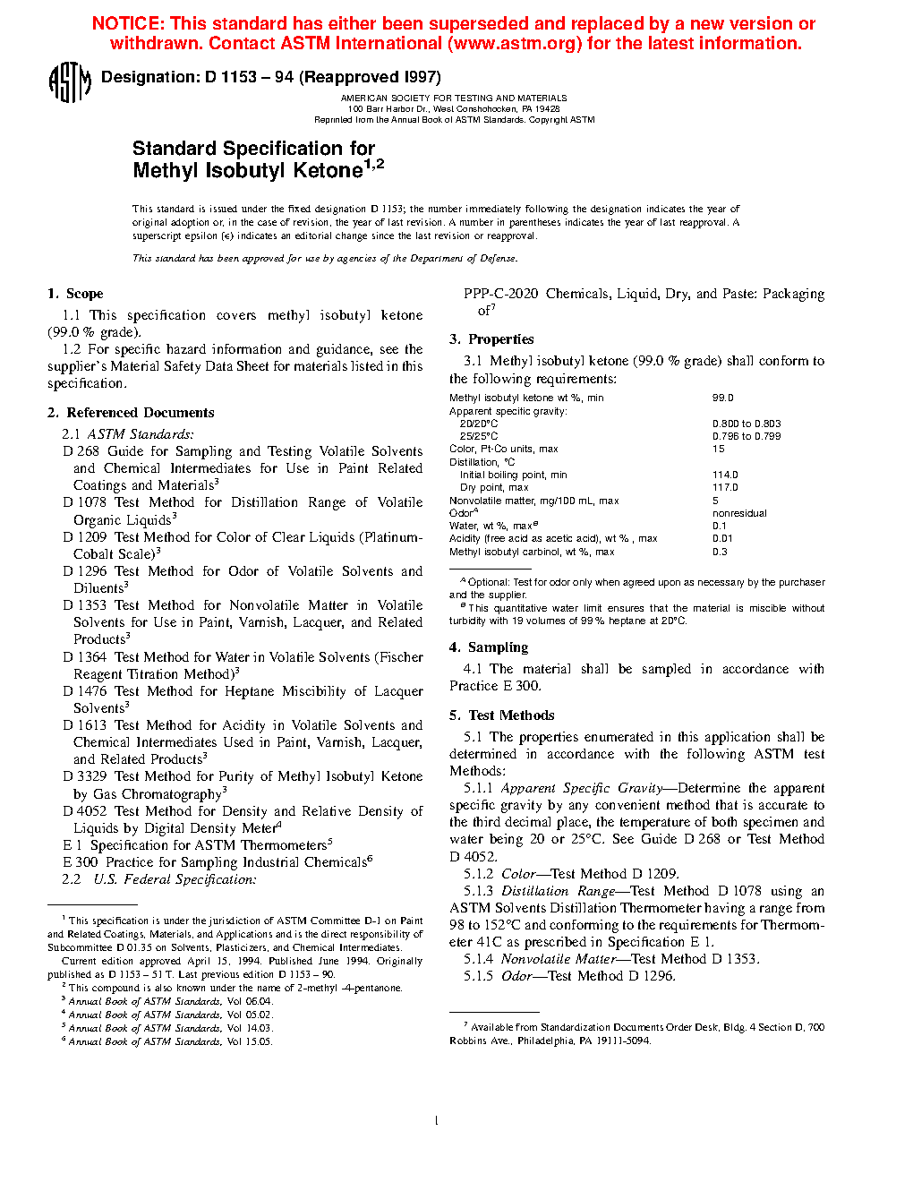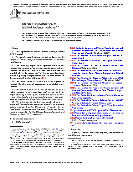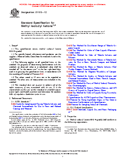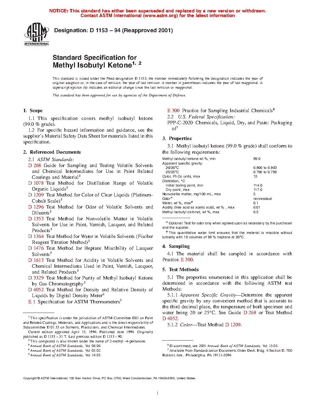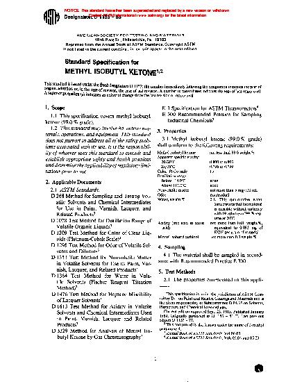 This specification covers methyl isobutyl ketone (99.0 % grade). The properties specified for methyl isobutyl ketone shall be determined in accordance with the following test methods: apparent specific gravity; color; distillation range; nonvolatile matter; odor; water; acidity; and alcohol and purity.