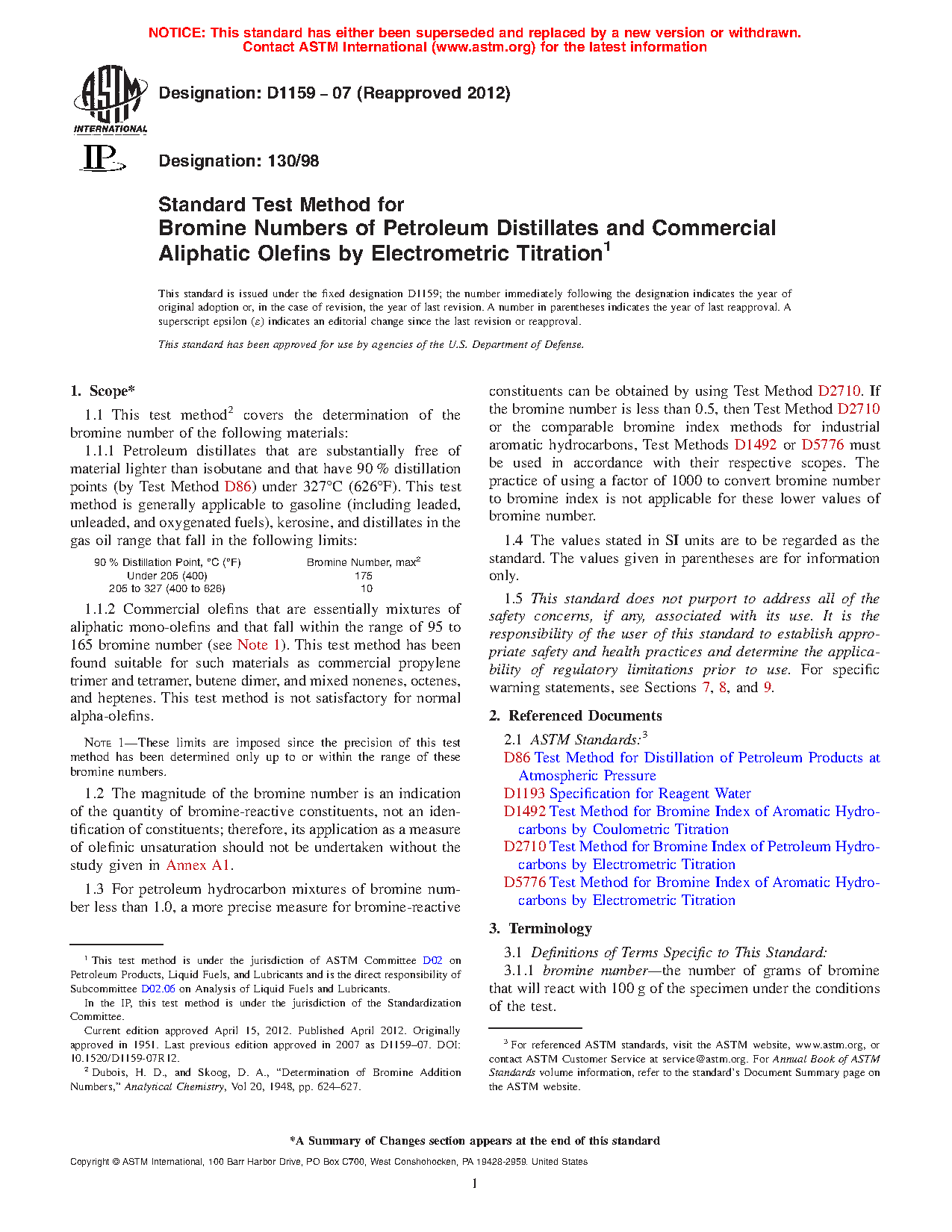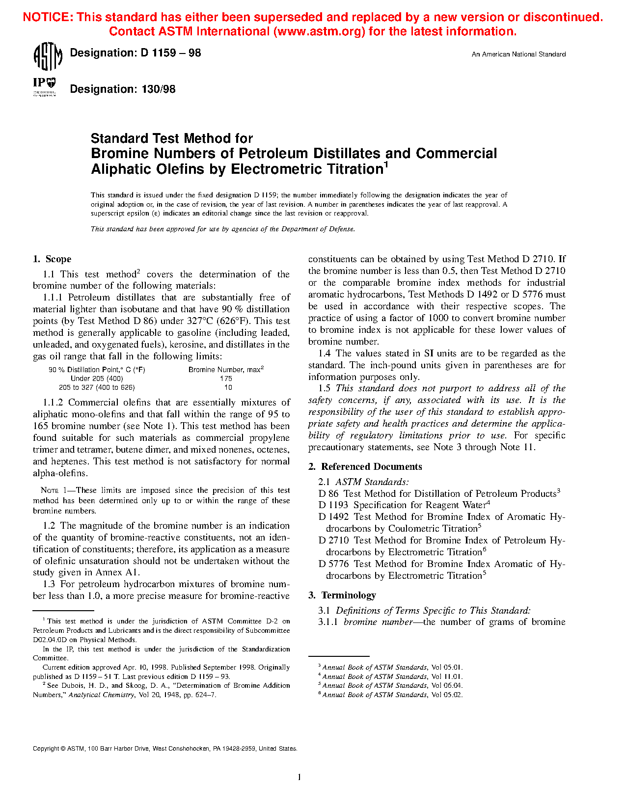 1.3 For petroleum hydrocarbon mixtures of bromine number less than 1.0, a more precise measure for bromine-reactive constituents can be obtained by using Test Method D2710. If the bromine number is less than 0.5, then Test Method D2710 or the comparable bromine index methods for industrial aromatic hydrocarbons, Test Methods D1492 or D5776 must be used in accordance with their respective scopes. The practice of using a factor of 1000 to convert bromine number to bromine index is not applicable for these lower values of bromine number.