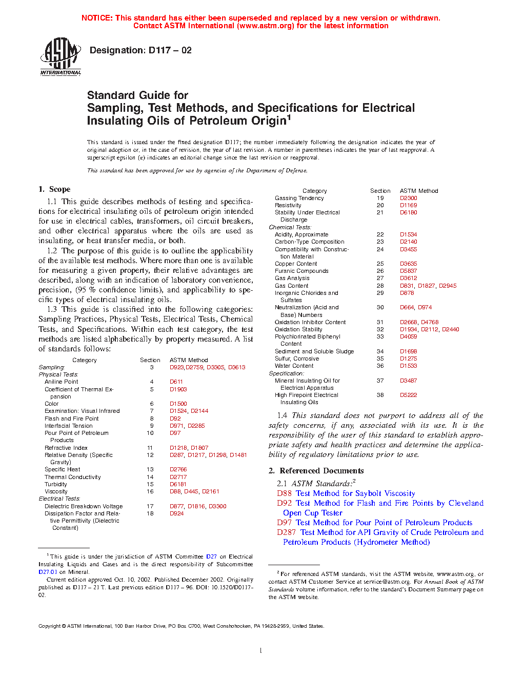 1.3 The guide is classified into the following categories: Sampling, Physical Tests, Electrical Tests, Chemical Tests, Specifications, and Guide. Within each test category, the test methods are listed alphabetically by property measured.