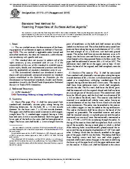1.1 This test method covers the determination of the foaming properties of surface-active agents as defined in Terminology D459. This test method is applicable under limited and controlled conditions, but does not necessarily yield information correlating with specific end uses. This method is subjected to the operator of the method as the foam heights are not always level and an average height is determined by the user so it is more of a qualitative measurement in these instances. However, for foam measurements results taken on more flat uniform samples this method has more of a quantitative quality.