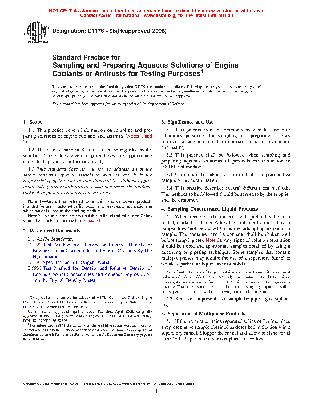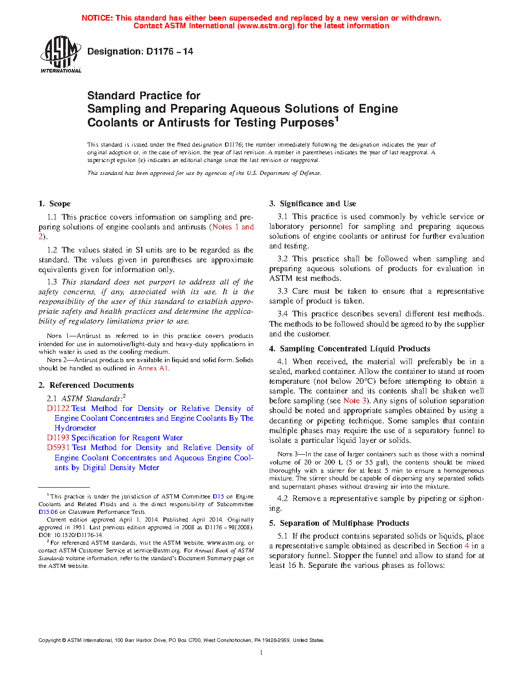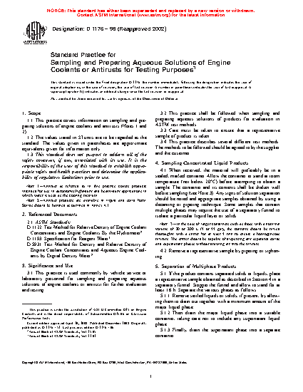 1.1 This practice covers information on sampling and preparing solutions of engine coolants and antirusts (Notes 1 and 2).
