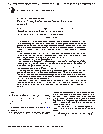 1.1 This test method covers the determination of the comparative properties of either metal or wood adhesive bonded assemblies when subjected to flexural stresses with standard shape specimens and under defined conditions of pretreatment, temperature, relative humidity, and testing technique. The test specimen and testing technique were designed to develop a large portion of shear forces between the laminae of the test piece when the load is applied, rather than to reduce shear stress to a minimum as is done in other ASTM test methods for flexural properties. This method is not applicable to assemblies made with nonrigid adherends. The data obtained are not suitable for design work.