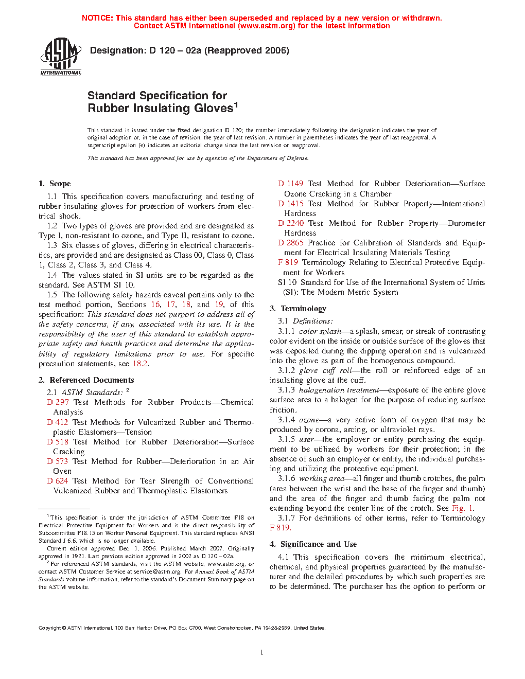 1.3 Six classes of gloves, differing in electrical characteristics, are provided and are designated as Class 00, Class 0, Class 1, Class 2, Class 3, and Class 4.