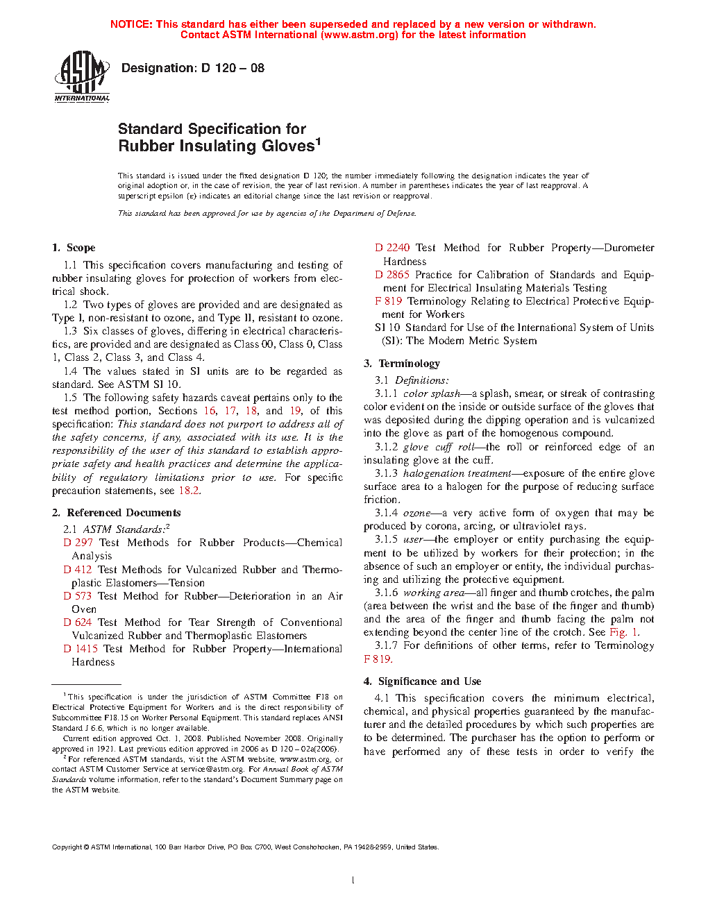 This specification covers manufacturing and testing of rubber insulating gloves for protection of workers from electrical shock. Two types of gloves are provided and are designated as Type I, non-resistant to ozone, and Type II, resistant to ozone. Six classes of gloves, differing in electrical characteristics, are provided and are designated as Class 00, Class 0, Class 1, Class 2, Class 3, and Class 4. The following tests shall be performed: ac proof test; ac breakdown test; ac moisture absorption/proof test; dc proof test; dc breakdown test; ozone resistance test; chemical tests; tensile strength; tear resistance test; and puncture resistance test.