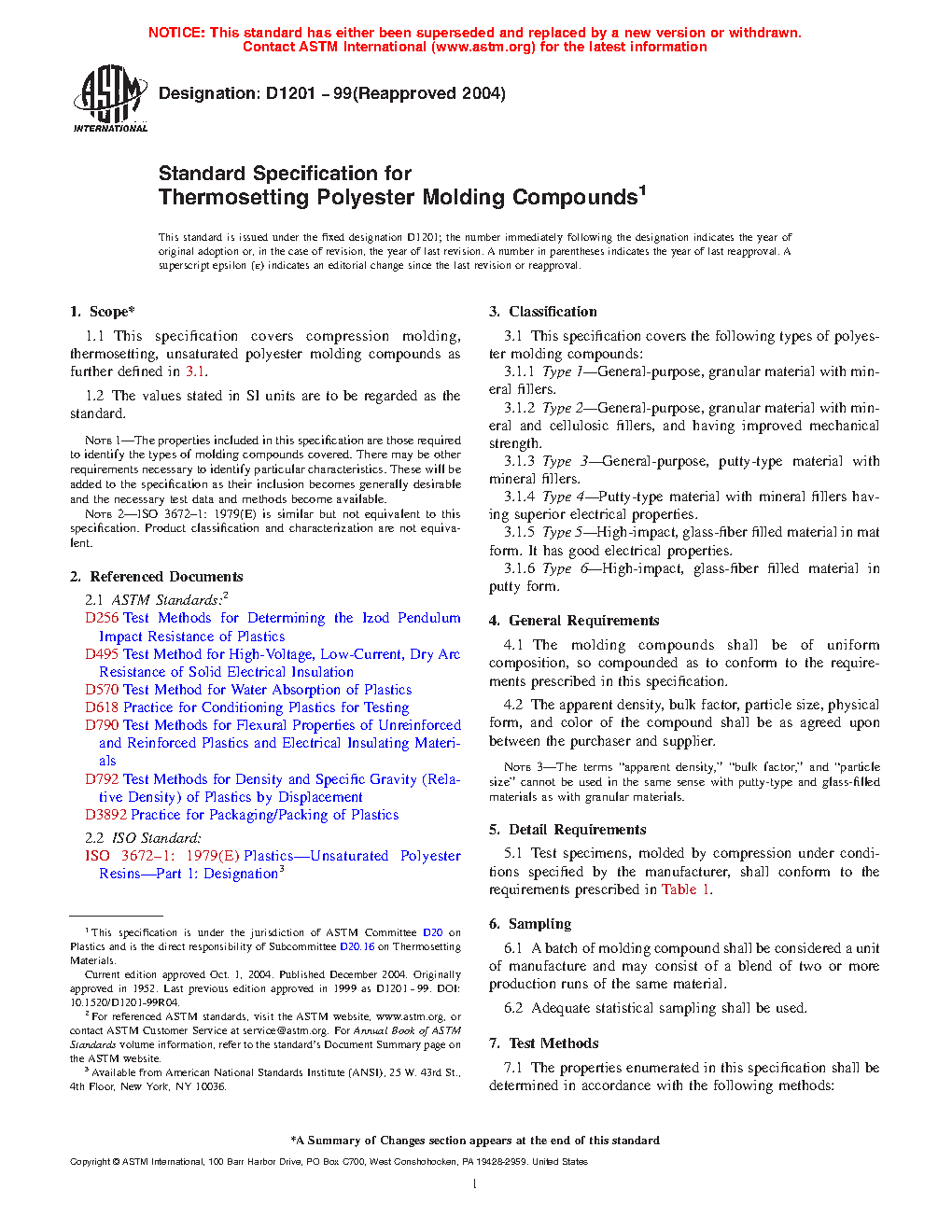 This specification deals with the classification, requirements, and testing of compression molding, thermosetting, unsaturated polyester molding compounds. Covered here are the following types of polyester molding compounds: Type 1 - general-purpose granular materials with mineral fillers; Type 2 - general-purpose granular materials with mineral and cellulosic fillers, and having improved mechanical strength; Type 3 - general-purpose putty-type materials with mineral fillers; Type 4 - putty-type materials with mineral fillers and having superior electrical properties; Type 5 - high-impact glass-fiber filled materials in mat form, and has good electrical properties; and Type 6 - high-impact glass-fiber filled materials in putty form. Sampled specimens shall be tested and conform accordingly to material requirements such as specific gravity, flexural strength, modulus of elasticity in flexure, Izod impact resistance, arc resistance, and water absorption.