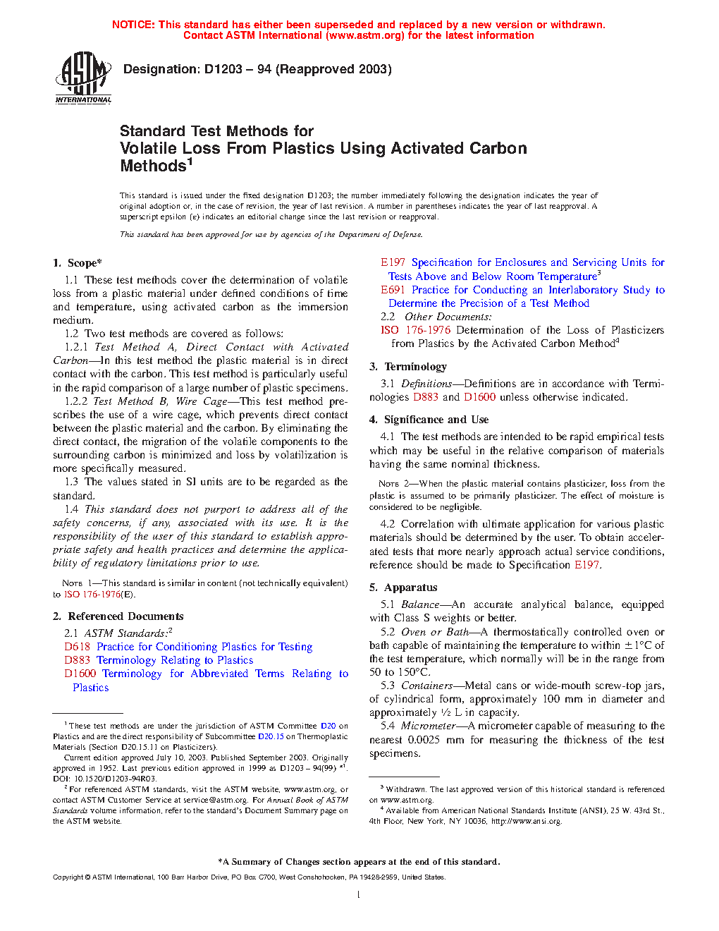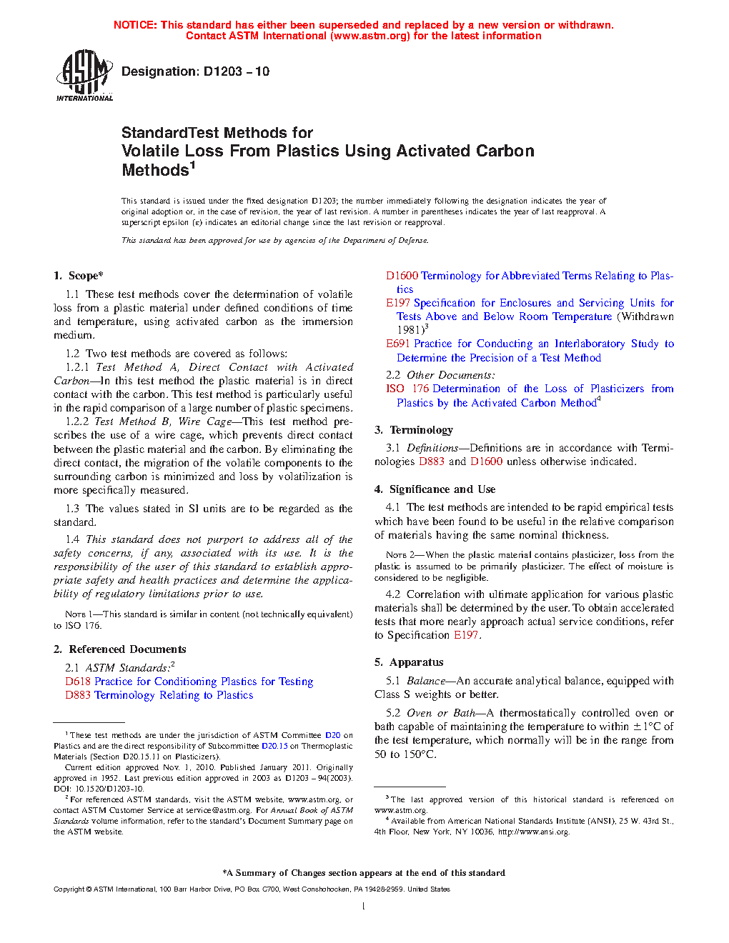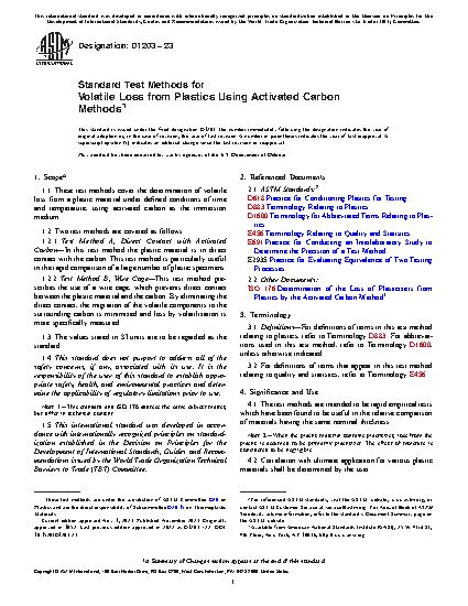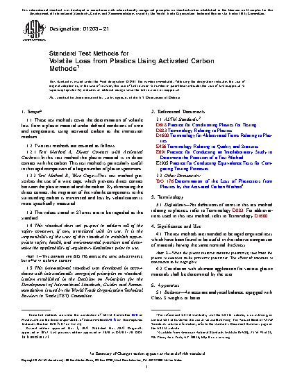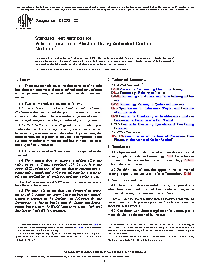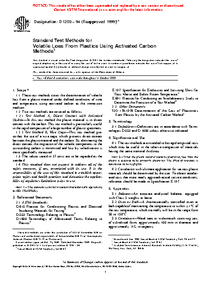 1.1 These test methods cover the determination of volatile loss from a plastic material under defined conditions of time and temperature, using activated carbon as the immersion medium.