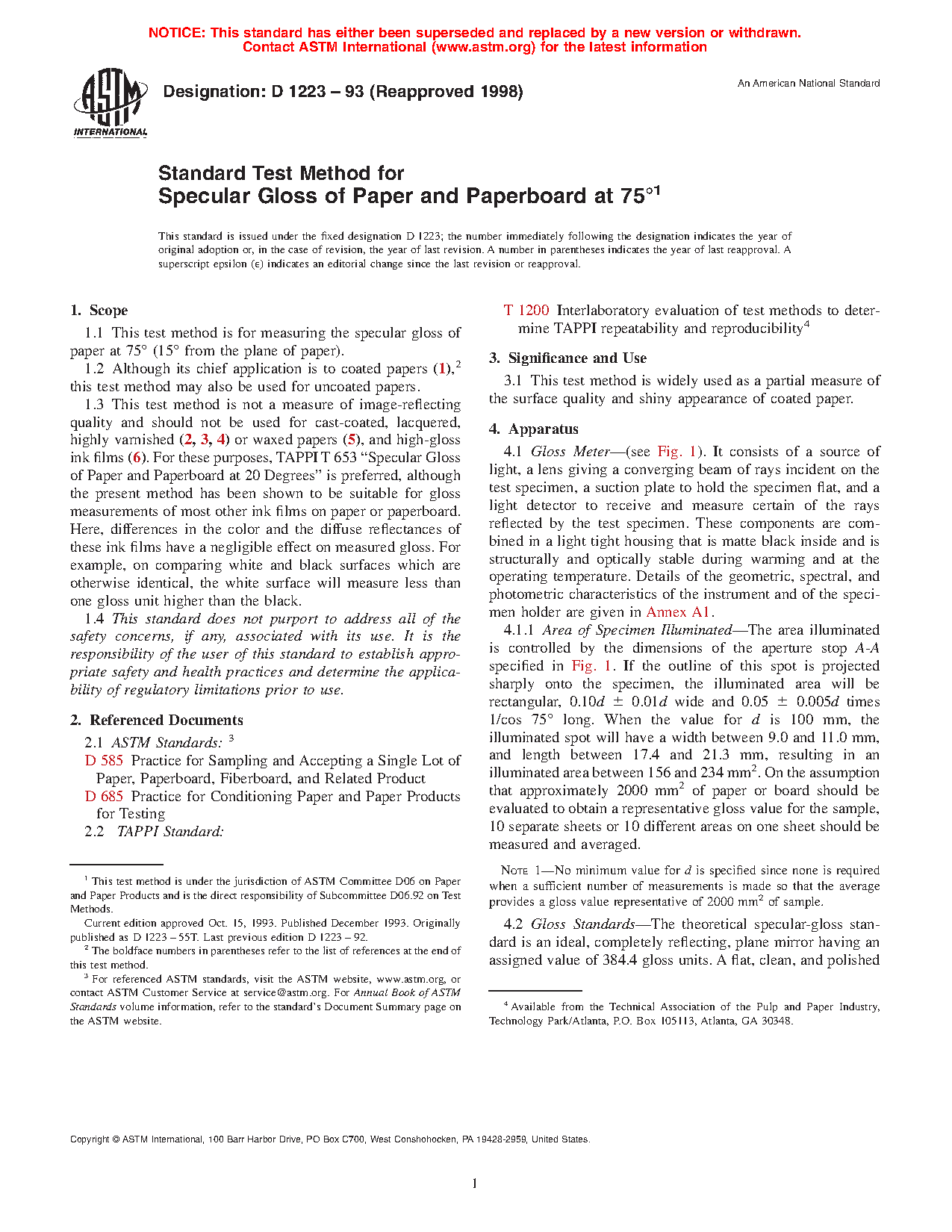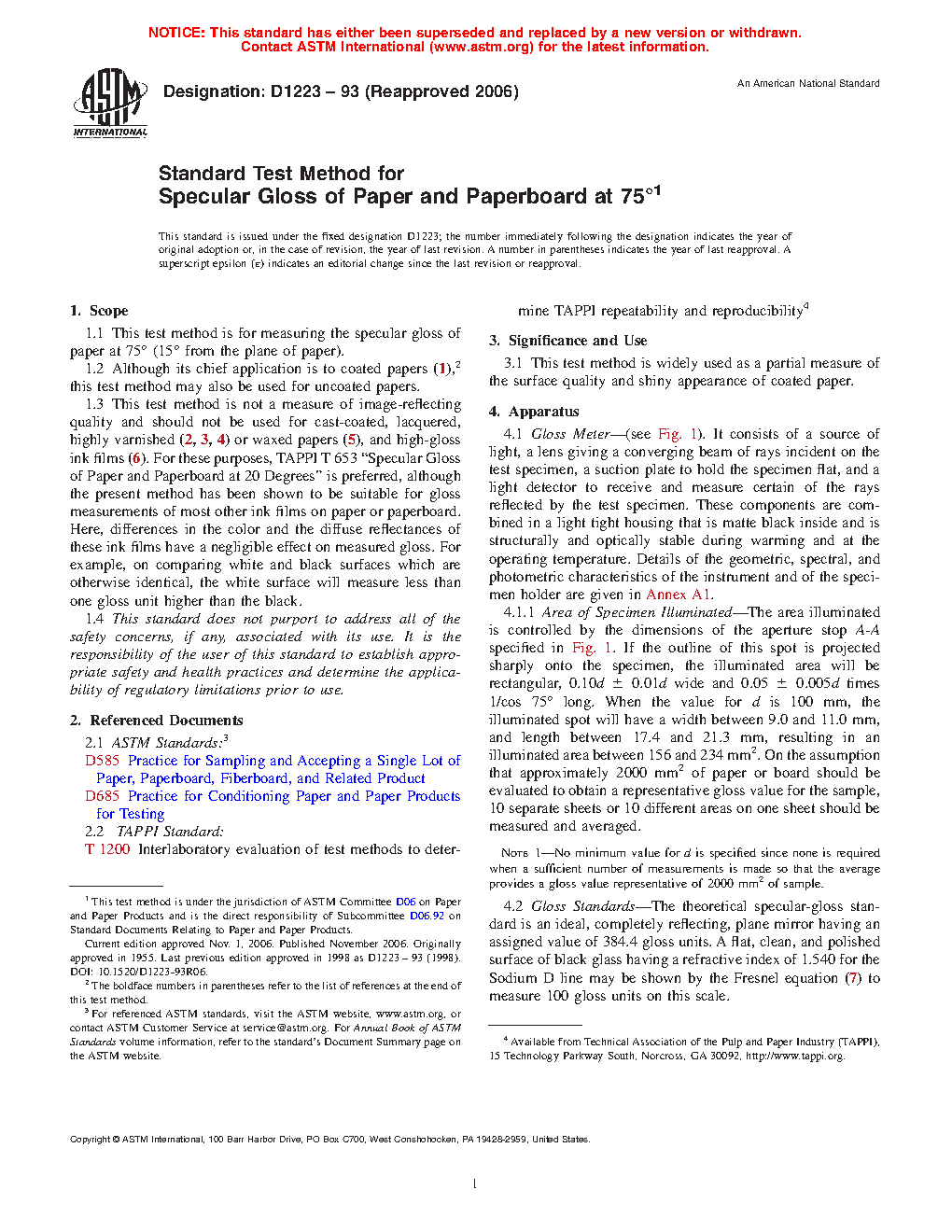 1.1 This test method is for measuring the specular gloss of paper at 75° (15° from the plane of paper).