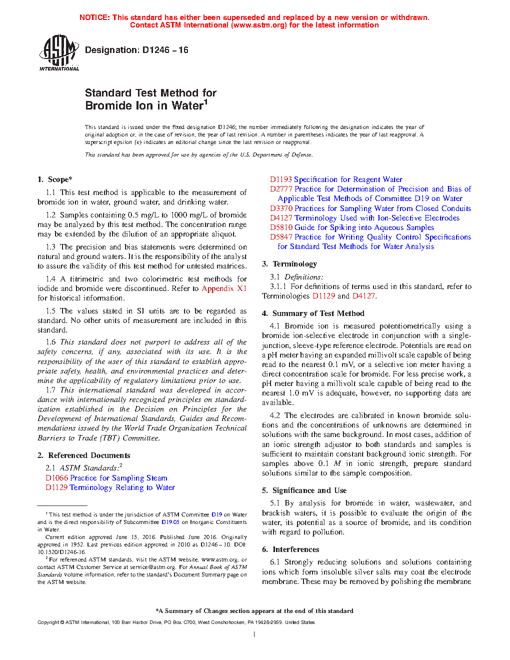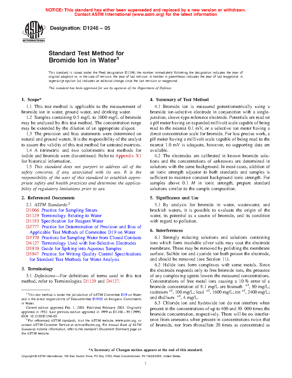 1.4 A titrimetric and two colorimetric test methods for iodide and bromide were discontinued. Refer to Appendix X1 for historical information.
