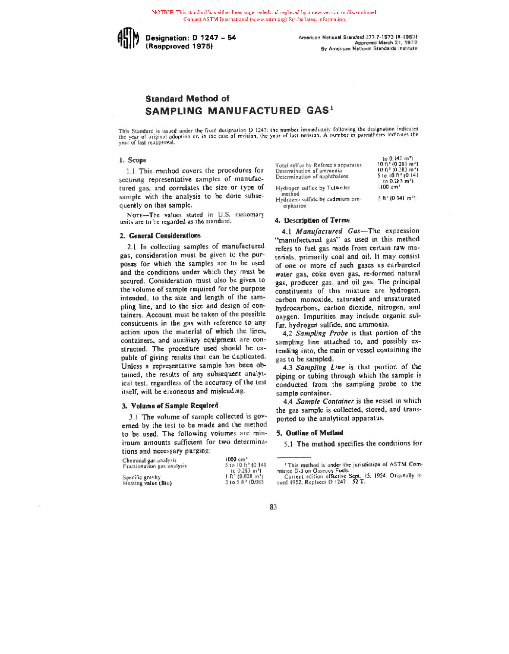 Method of Sampling Manufactured Gas (Withdrawn 1986)