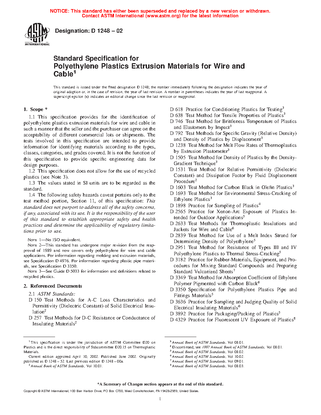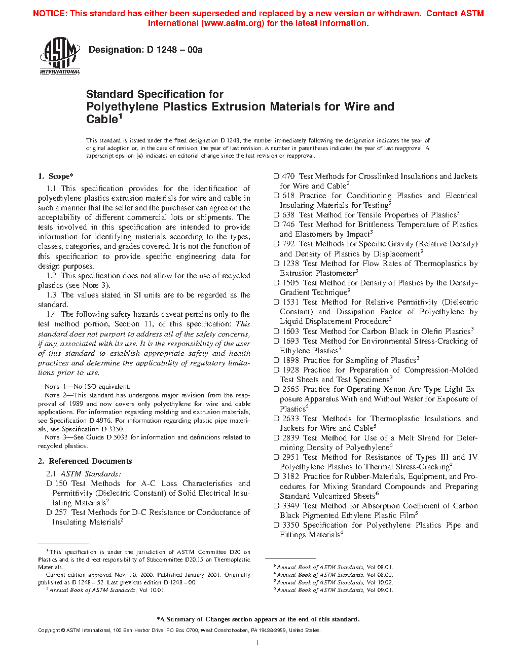 Note 2: This standard has undergone major revision from the reapproval of 1989 and now covers only polyethylene for wire and cable applications. For information regarding molding and extrusion materials, see Specification D4976. For information regarding plastic pipe materials, see Specification D3350.
