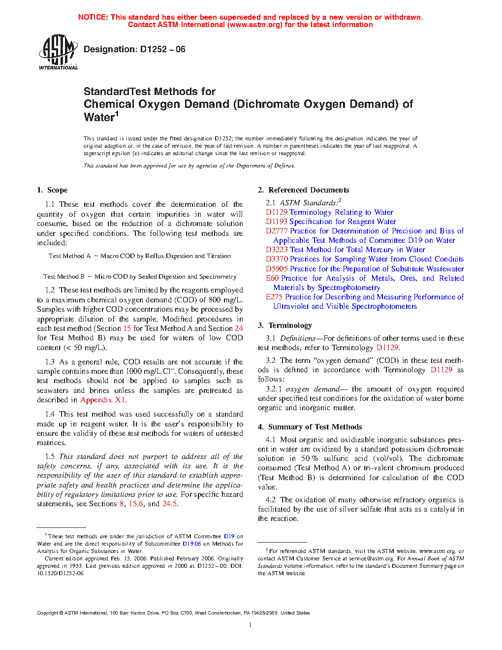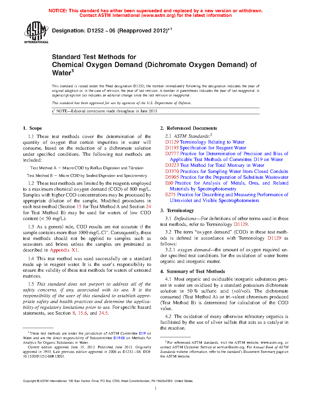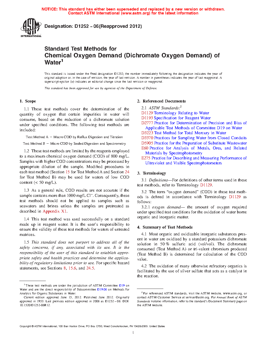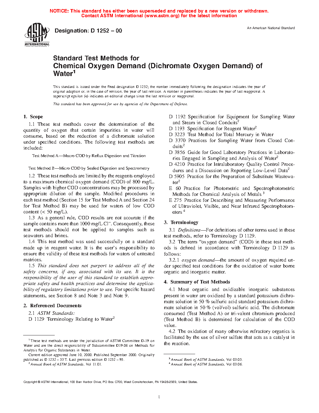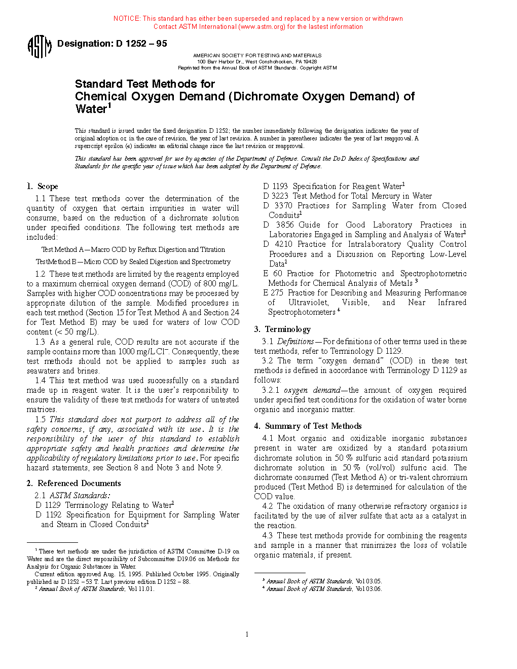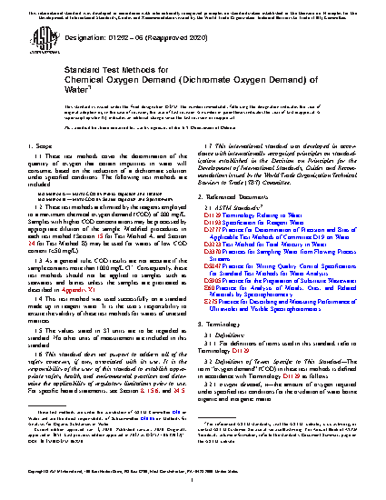1.1 These test methods cover the determination of the quantity of oxygen that certain impurities in water will consume, based on the reduction of a dichromate solution under specified conditions. The following test methods are included: