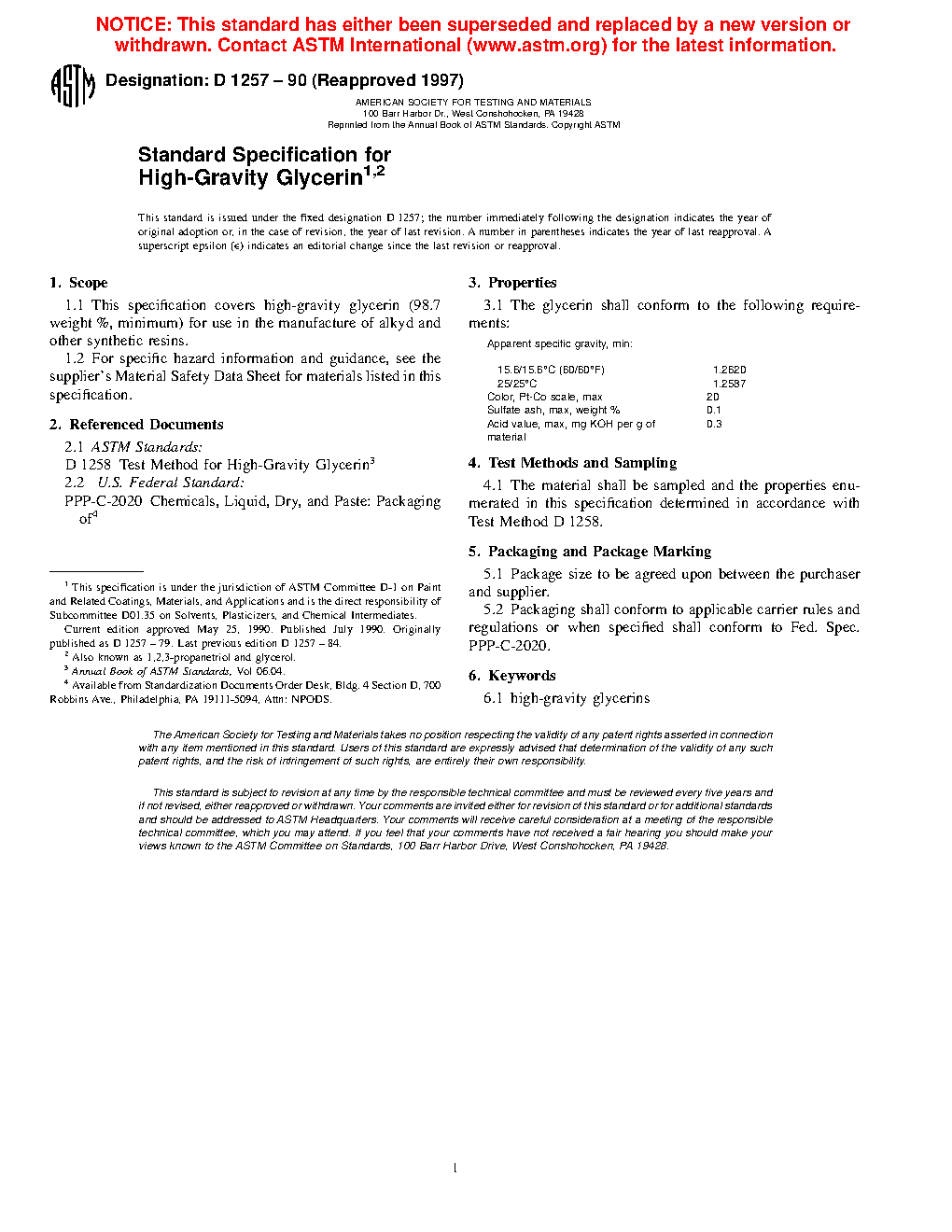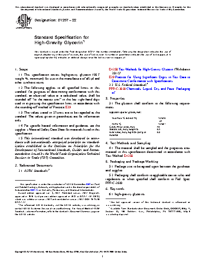 1.1 This specification covers high-gravity glycerin (98.7 weight%, minimum) for use in the manufacture of alkyd and other synthetic resins.