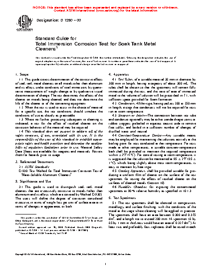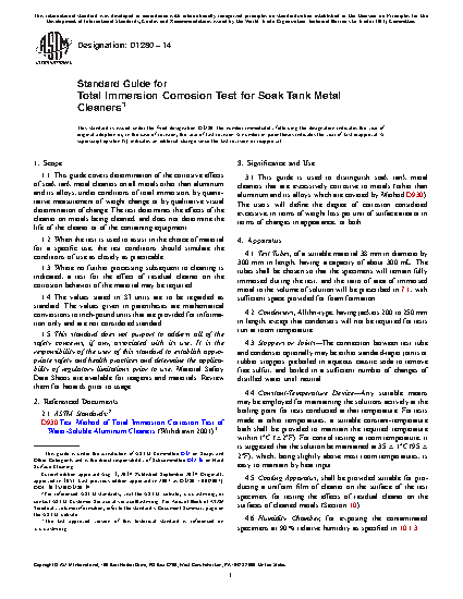 1.1 This guide covers determination of the corrosive effects of soak tank metal cleaners on all metals other than aluminum and its alloys, under conditions of total immersion, by quantitative measurement of weight change or by qualitative visual determination of change. The test determines the effects of the cleaner on metals being cleaned, and does not determine the life of the cleaner or of the containing equipment.