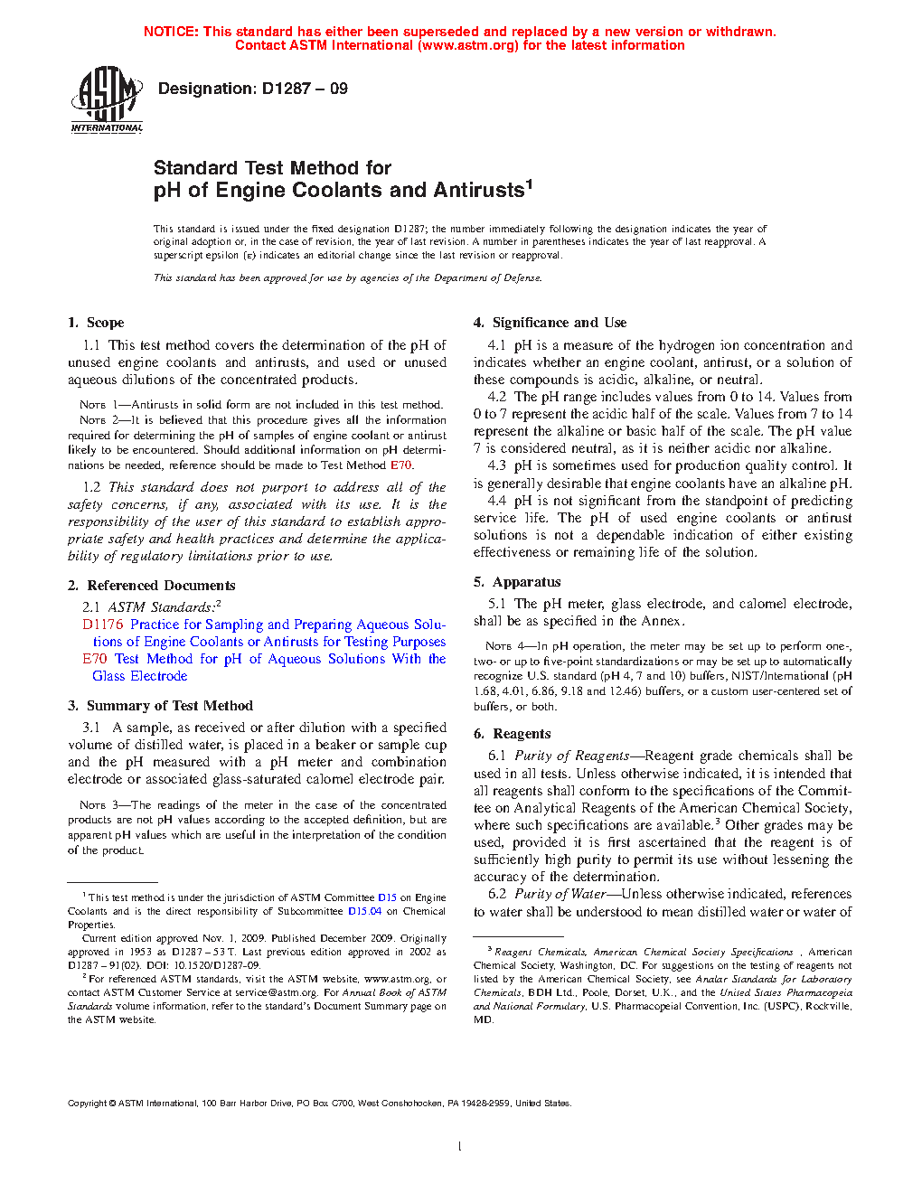 1.1 This test method covers the determination of the pH of unused engine coolants and antirusts, and used or unused aqueous dilutions of the concentrated products.