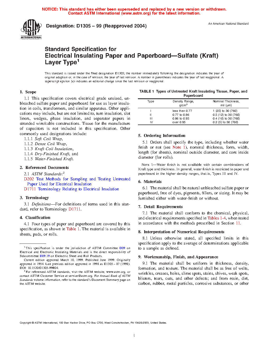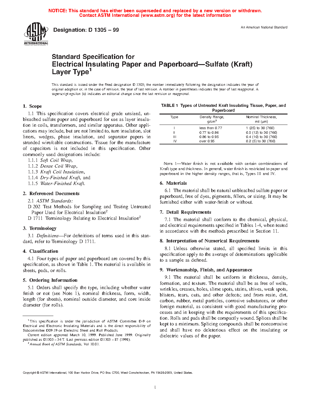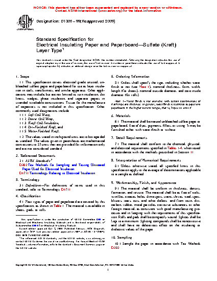 This specification covers electrically insulating, unbleached sulfate paper and paperboard used as layer insulation in coils, transformers, and other similar apparatus. The materials may also be used as turn insulation, slot liners, wedges, phase insulation, and separator papers in stranded wire/cable constructions. This specification does not include tissue for manufacture of capacitors. Other commonly used terms for the materials include soft coil wrap, dense coil wrap, kraft coil insulation, dry-finished kraft, and water-finished kraft. The materials covered in this specification are classified into four types according to density range and nominal thickness and should conform to the required values of ash content, alcohol-soluble material content, aqueous extract conductivity, water-soluble chloride content, fiber composition, moisture content, hydrogen ion concentration, pH, tensile strength, dielectric breakdown voltage, and conducting paths.