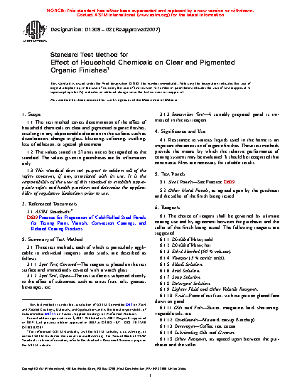 1.1 This test method covers determination of the effect of household chemicals on clear and pigmented organic finishes, resulting in any objectionable alteration in the surface, such as discoloration, change in gloss, blistering, softening, swelling, loss of adhesion, or special phenomena.