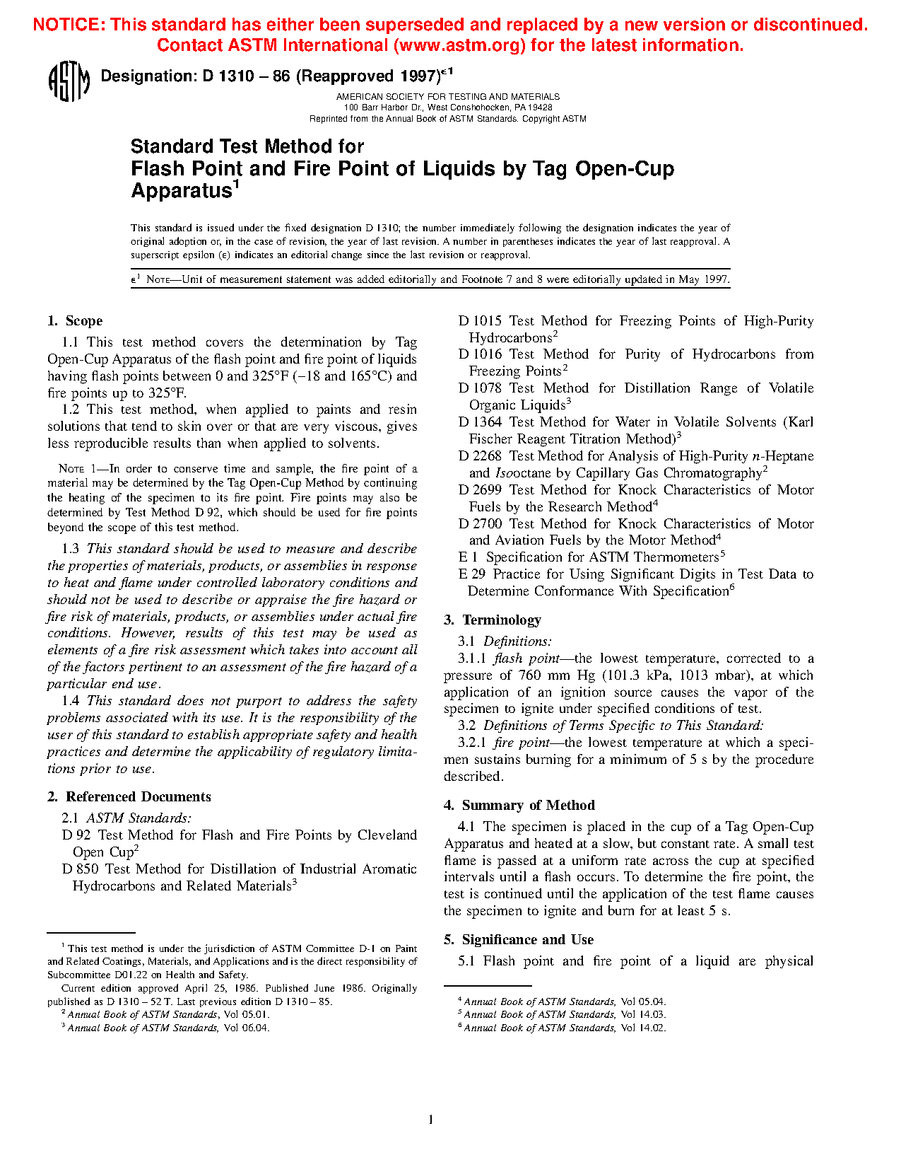 1.1 This test method covers the determination by Tag Open-Cup Apparatus of the flash point and fire point of liquids having flash points between -18 and 165°C (0 and 325°F) and fire points up to 325°F.