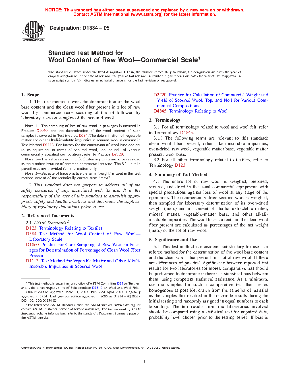 Note 1: The sampling of lots of raw wool in packages is covered in Practice D1060, and the determination of the wool content of such samples is covered in Test Method D584. The determination of vegetable matter and other alkali-insoluble impurities in scoured wool is covered in Test Method D1113. For factors for the conversion of wool base content to its equivalent in terms of scoured wool, top, or noil of various commercially specified compositions, refer to Practice D2720.