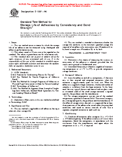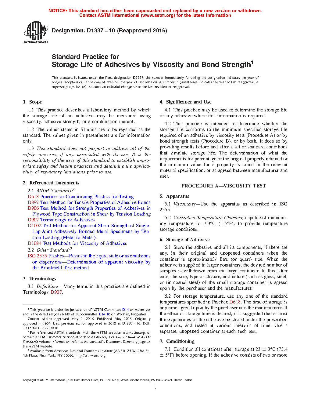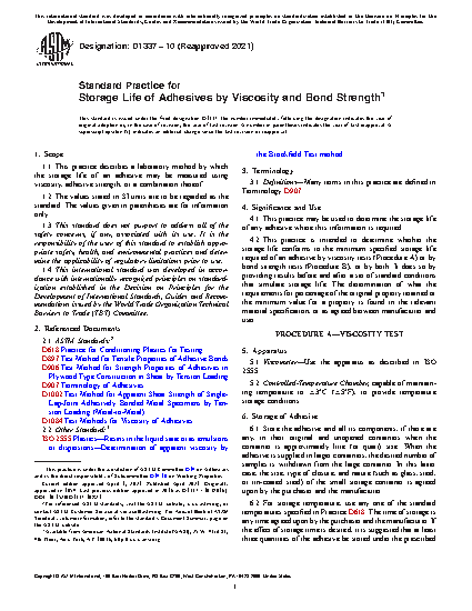 This practice is intended to determine whether the storage life conforms to the minimum specified storage life required of an adhesive by viscosity tests (Procedure A) or by bond strength tests (Procedure B), or by both. It does so by providing results before and after a set of standard conditions that simulate storage life. The determination of what the requirements for percentage of the original property retained or the minimum value for a property is found in the relevant material specification, or as agreed between manufacturer and user.