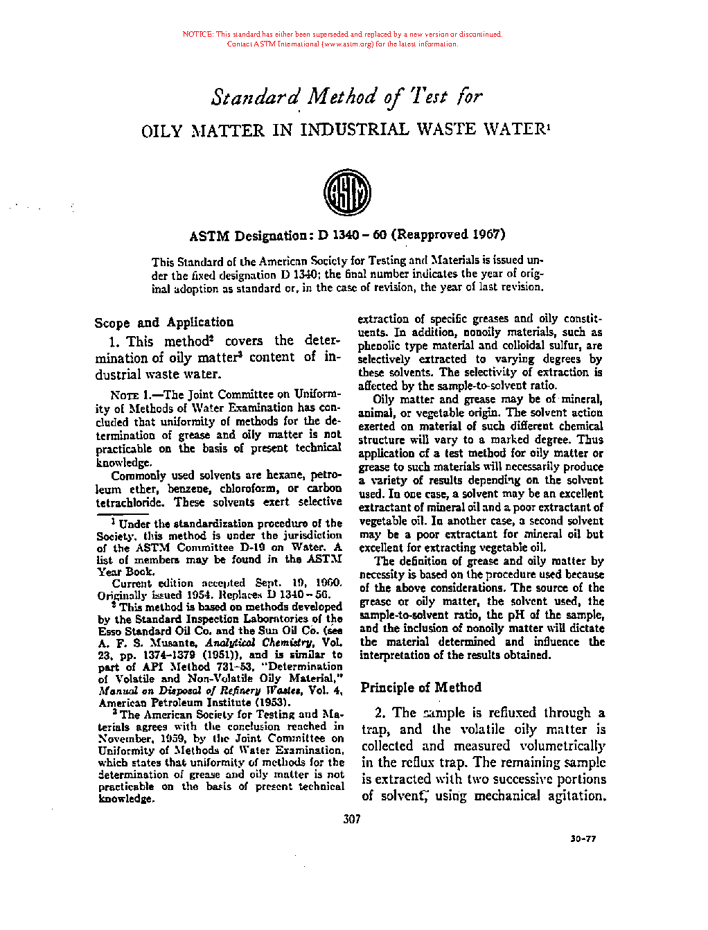 Method of Test for Oily Matter in Industrial Waste Water (Withdrawn 1970)