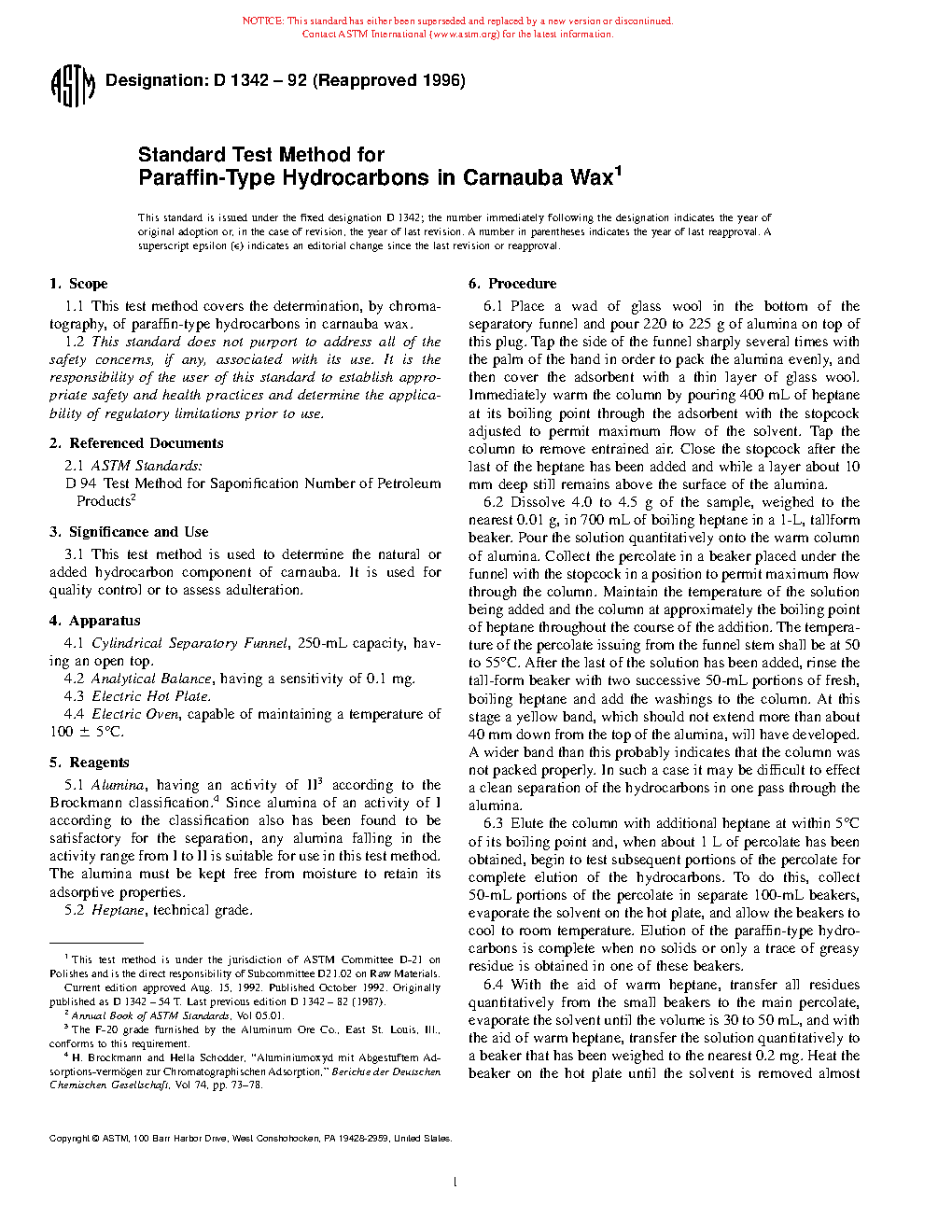 Standard Test Method for Paraffin-Type Hydrocarbons in Carnauba Wax