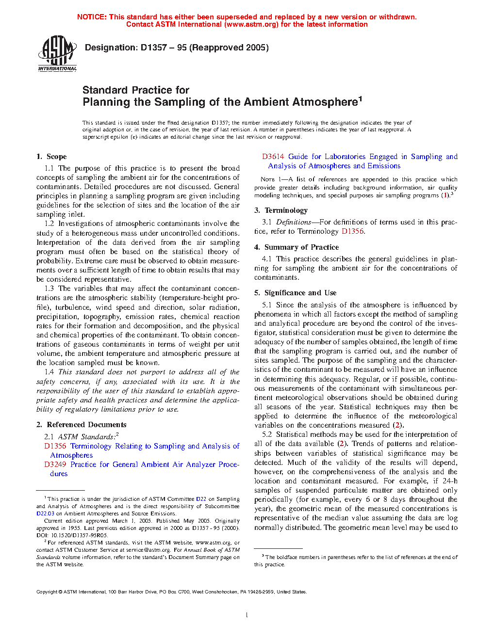 1.1 The purpose of this practice is to present the broad concepts of sampling the ambient air for the concentrations of contaminants. Detailed procedures are not discussed. General principles in planning a sampling program are given including guidelines for the selection of sites and the location of the air sampling inlet.