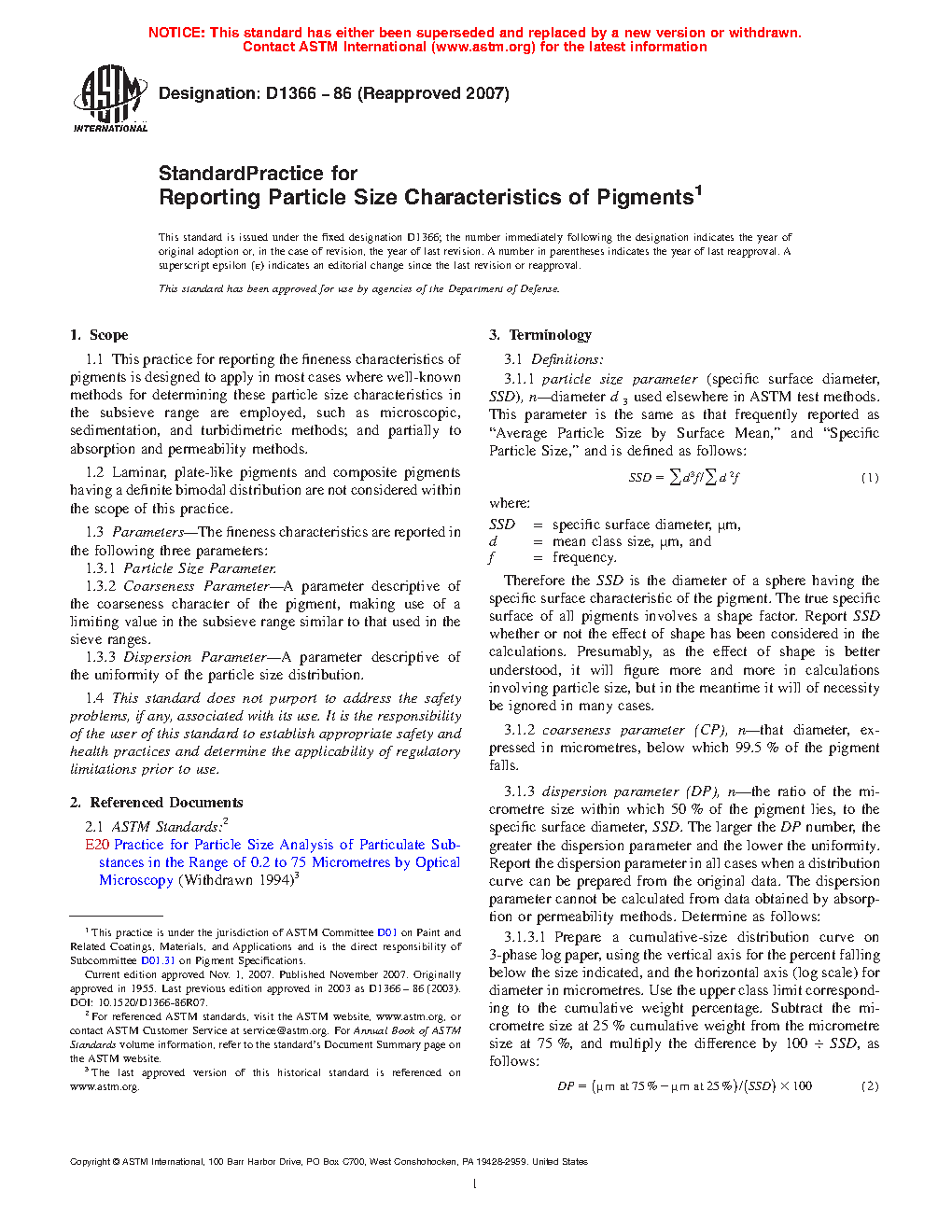 1.1 This practice for reporting the fineness characteristics of pigments is designed to apply in most cases where well-known methods for determining these particle size characteristics in the subsieve range are employed, such as microscopic, sedimentation, and turbidimetric methods; and partially to absorption and permeability methods.