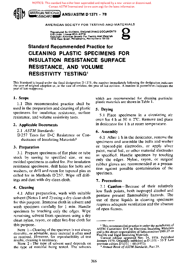 Recommended Practice for Cleaning Plastic Specimens for Industrial Resistance, Surface Resistance, and Volume Resistivity Testing (Withdrawn 1982)