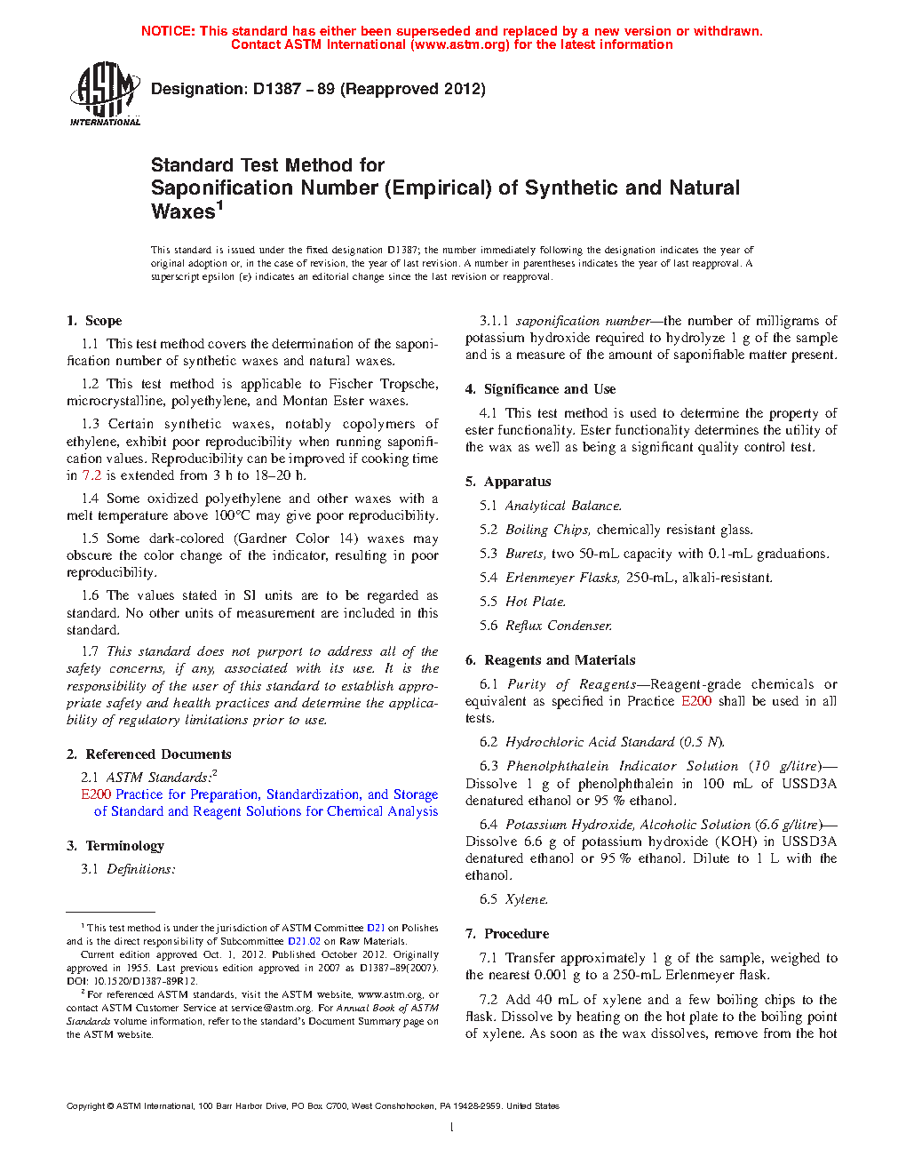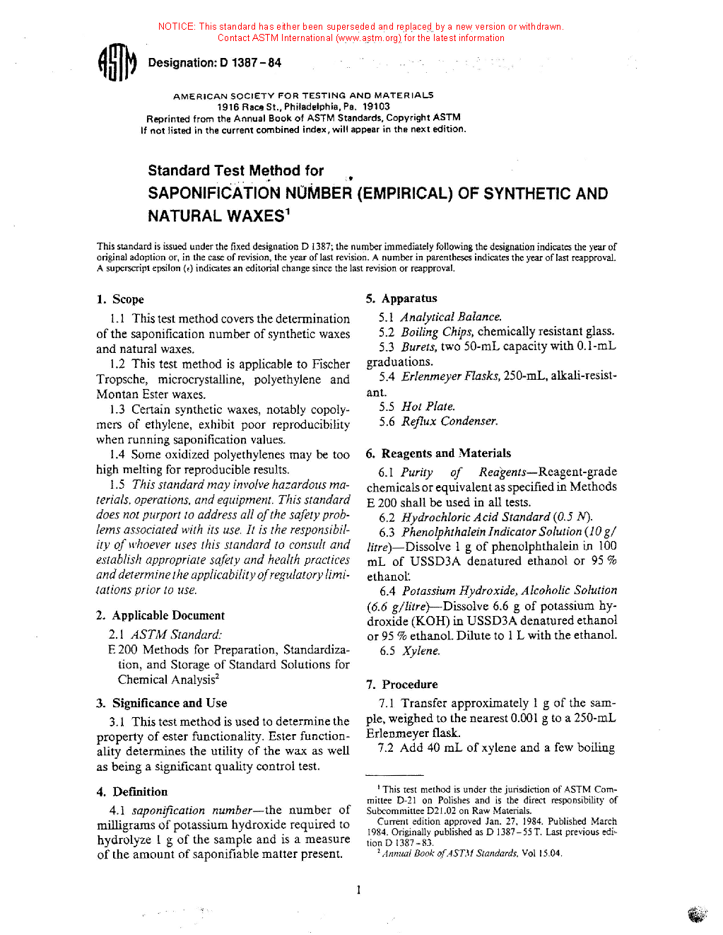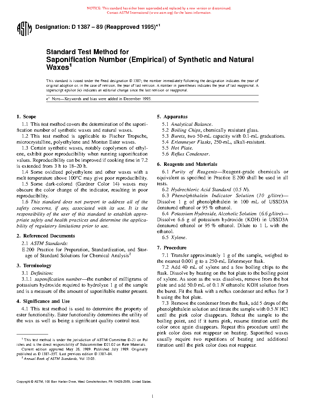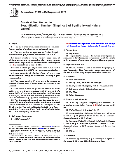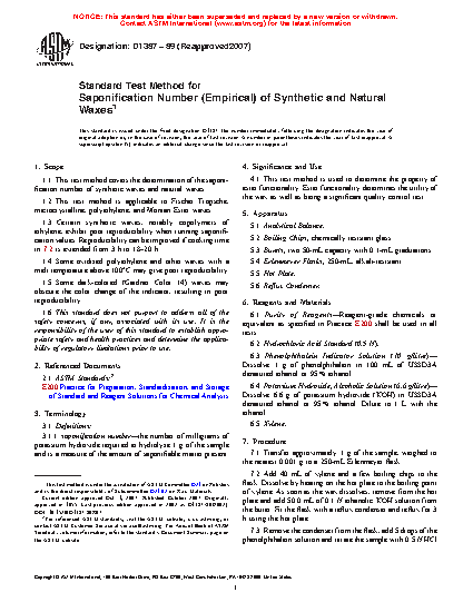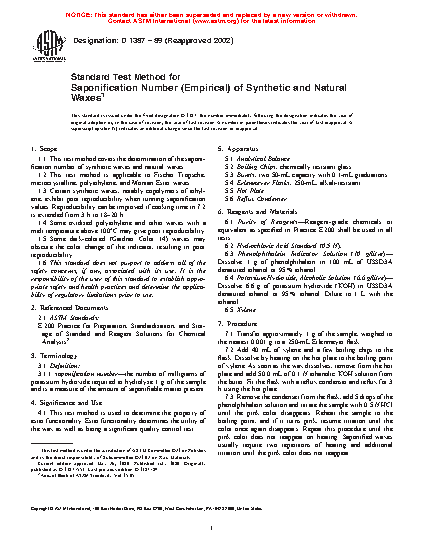 1.3 Certain synthetic waxes, notably copolymers of ethylene, exhibit poor reproducibility when running saponification values. Reproducibility can be improved if cooking time in 7.2 is extended from 3 h to 18–20 h.