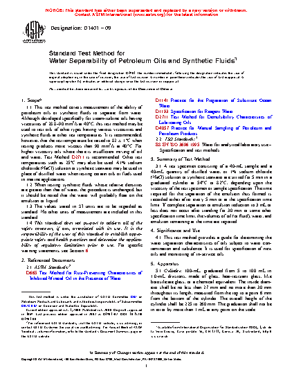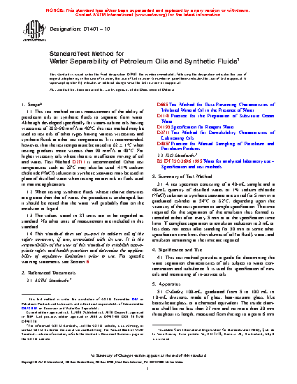 1.1 This test method covers measurement of the ability of petroleum oils or synthetic fluids to separate from water. Although developed specifically for steam-turbine oils having viscosities of 28.8 mm2/s to 90 mm2/s at 40 °C, this test method may be used to test oils of other types having various viscosities and synthetic fluids at other test temperatures. It is recommended, however, that the test temperature be raised to 82 °C ± 1 °C when testing products more viscous than 90 mm2/s at 40 °C. For higher viscosity oils where there is insufficient mixing of oil and water, Test Method D2711 is recommended. Other test temperatures such as 25 °C may also be used. A 1 % sodium choloride (NaCl) solution or synthetic seawater may be used in place of distilled water when testing certain oils or fuels used in marine applications.