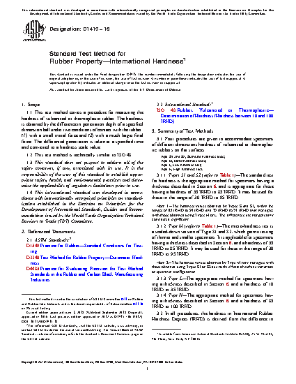 4.1.1.1 The term “usual range of resilience” is used to exclude those compounds that have unusually high rates of stress relaxation or deformational hysteresis. For such compounds, differences in the dwell time in the two hardness tests (Test Methods D2240 and D1415) result in differences in hardness values. Readings may not be comparable when testing curved or irregularly shaped test specimens.