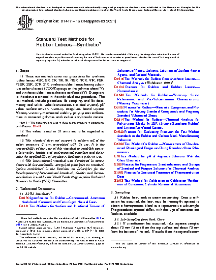 1.3 This standard does not purport to address all of the safety concerns, if any, associated with its use. It is the responsibility of the user of this standard to establish appropriate safety and health practices and determine the applicability of regulatory limitations prior to use. These test methods cover the synthetic rubber lattices ABR, BR, CR, IIR, NBR, NCR, NIR, PBR, PSBR, SBR, SCR, SIR, synthetic rubber lattices with substituted carboxylic acid groups on the polymer chain, and reinforced synthetic rubber lattices. Covered tests include the procedure for collecting samples and determining total solid content, volatile unsaturates content, pH, surface tension, viscosity, coagulum, bound styrene, Mooney viscosity, mechanical stability, polystyrene reinforcement in contained polymer, and residual acrylonitrile content. Each test method contains information on material exceptions, apparatus, and test procedures.