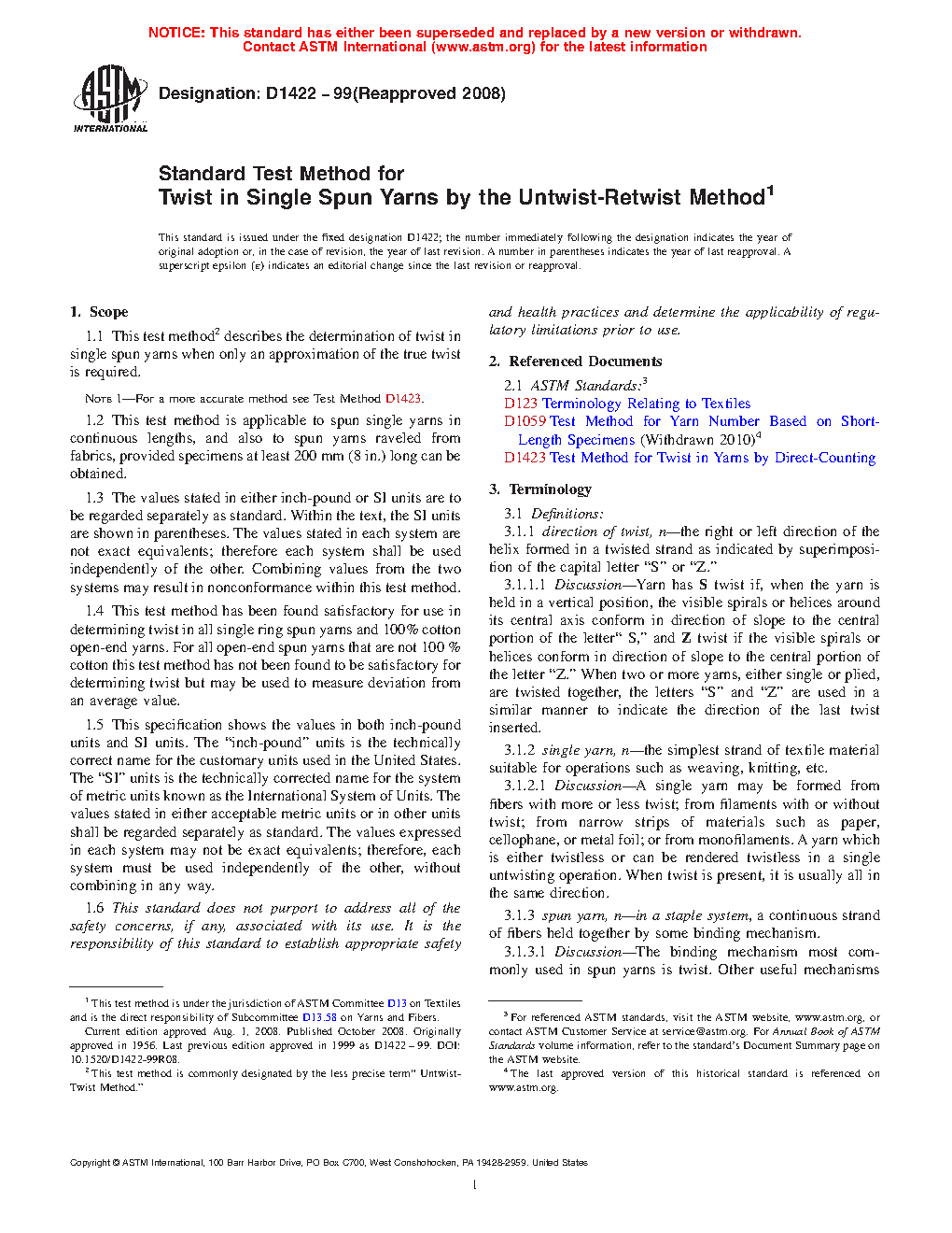 1.3 This test method has been found satisfactory for use in determining the approximate twist content in single ring spun yarns of all types and fiber contents, but not in open-end spun yarns.
