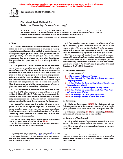 5.1 Test Method D1423 for testing twist in yarns by direct-counting is considered satisfactory for acceptance testing of commercial shipments because current estimates of between-laboratory precision are acceptable and the method has been used extensively in the trade for acceptance testing.