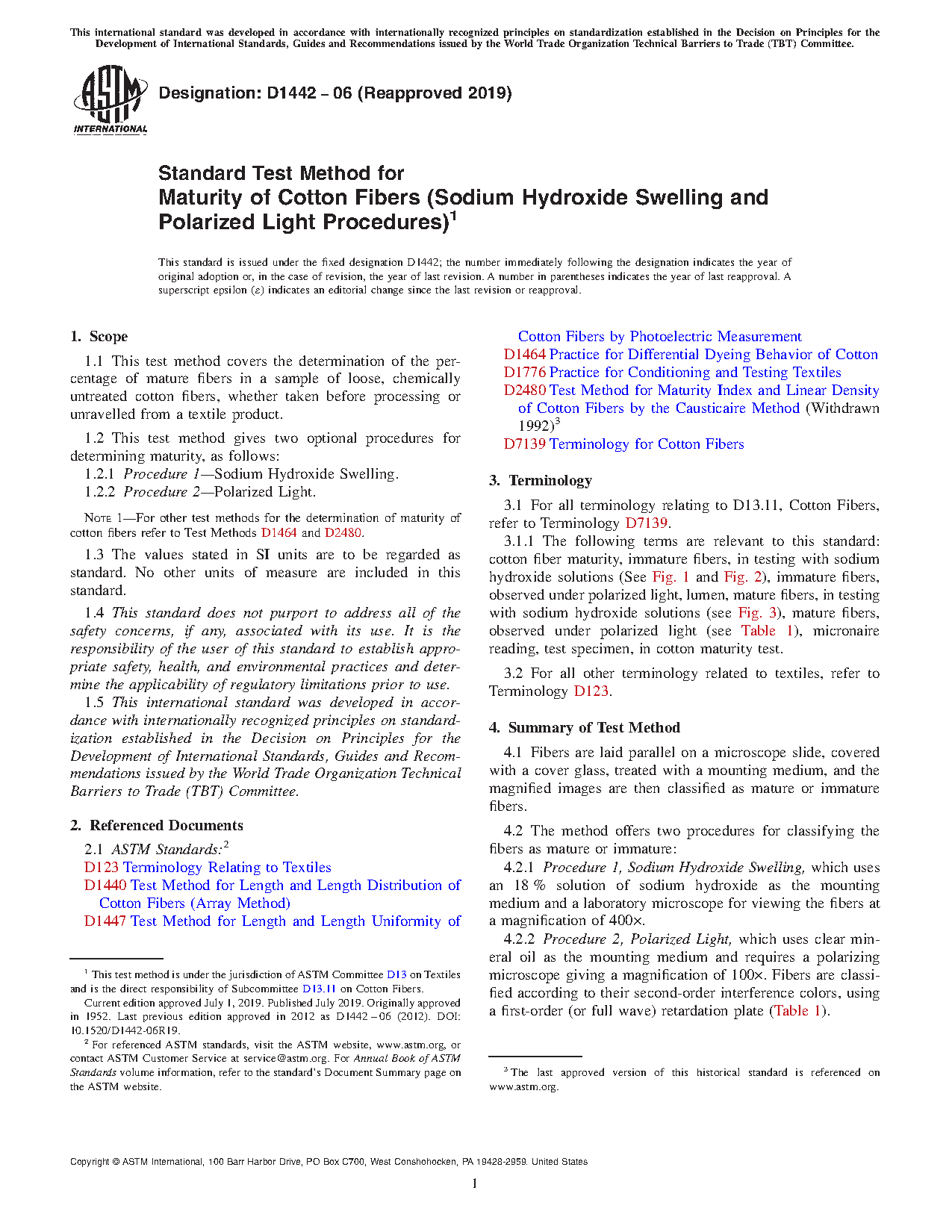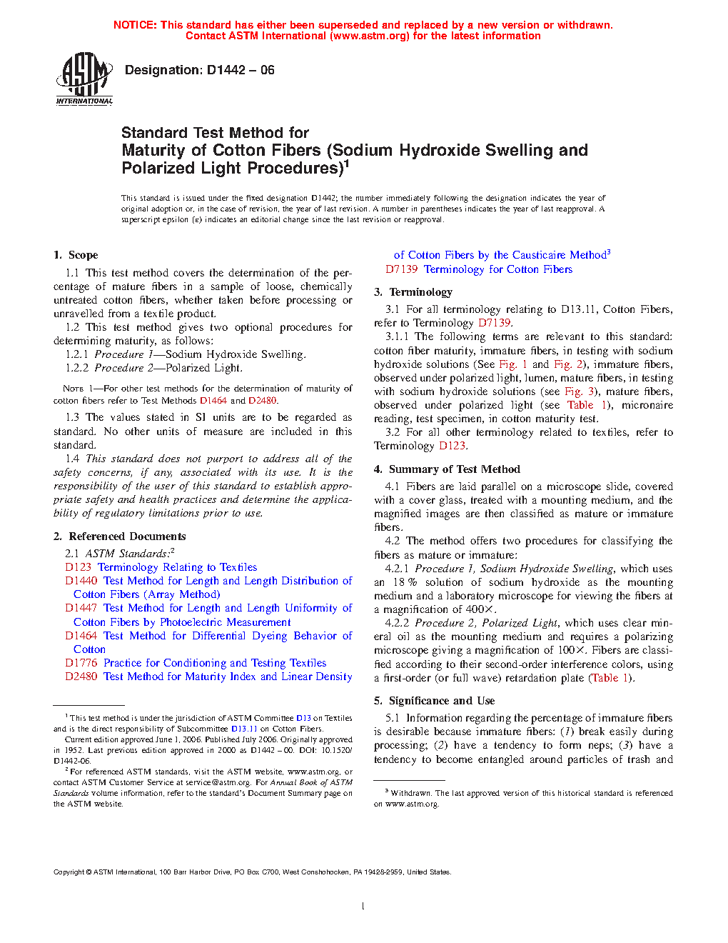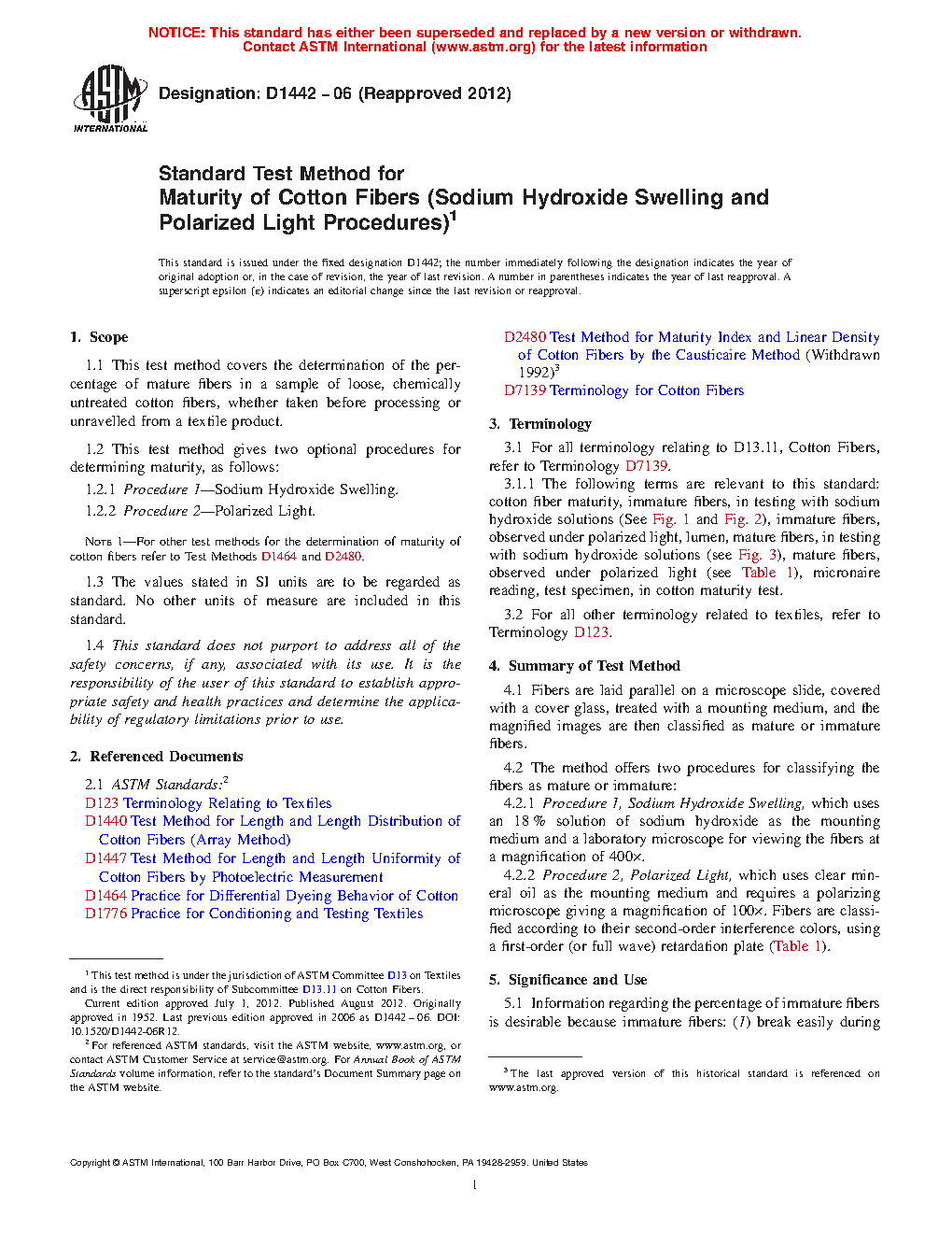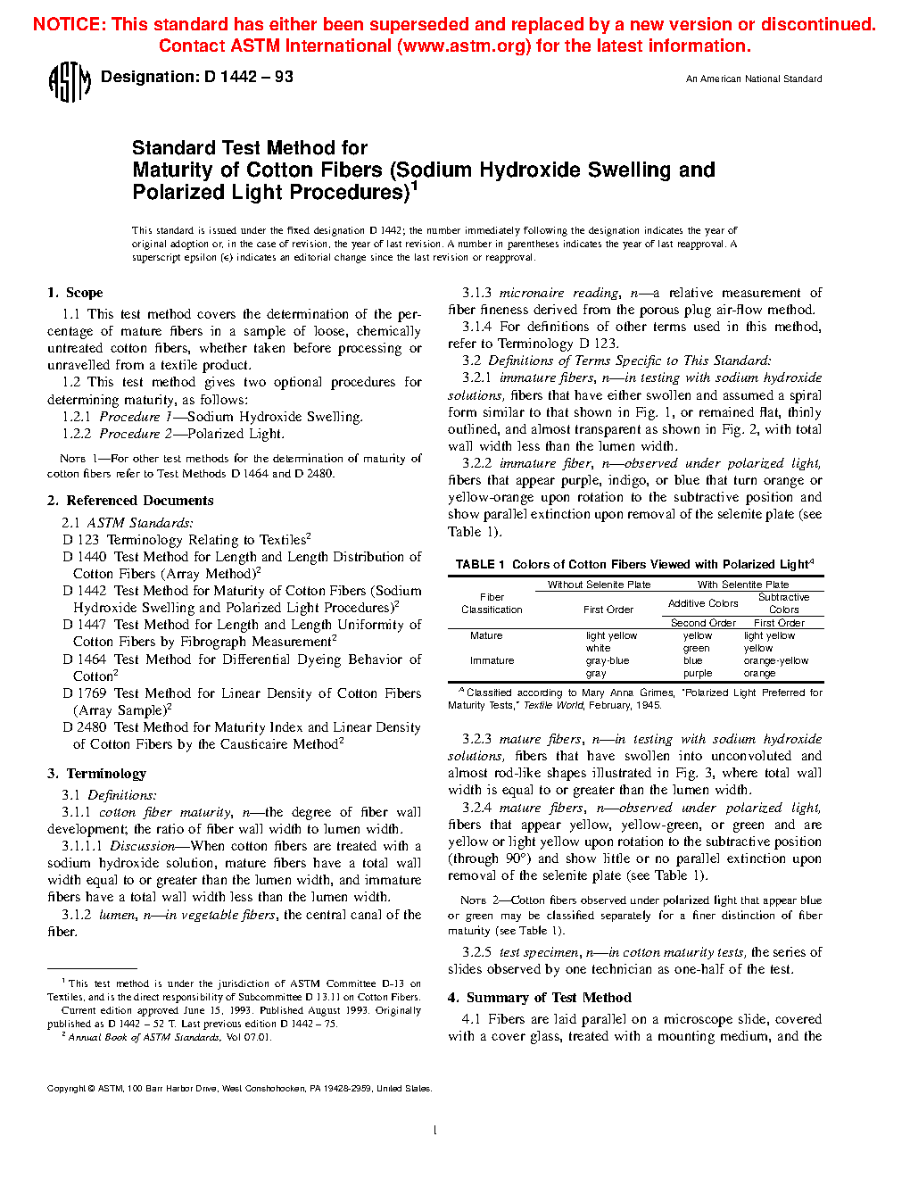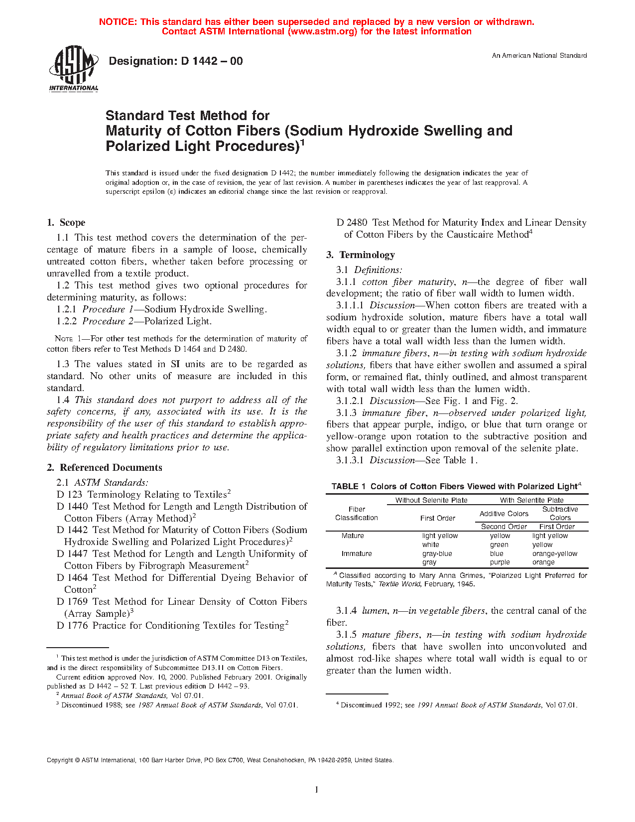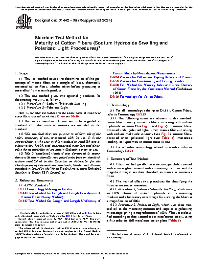 1.2.2 Procedure 2Polarized Light. For other test methods for the determination of maturity of cotton fibers refer to Test Methods D 1464 and D 2480.