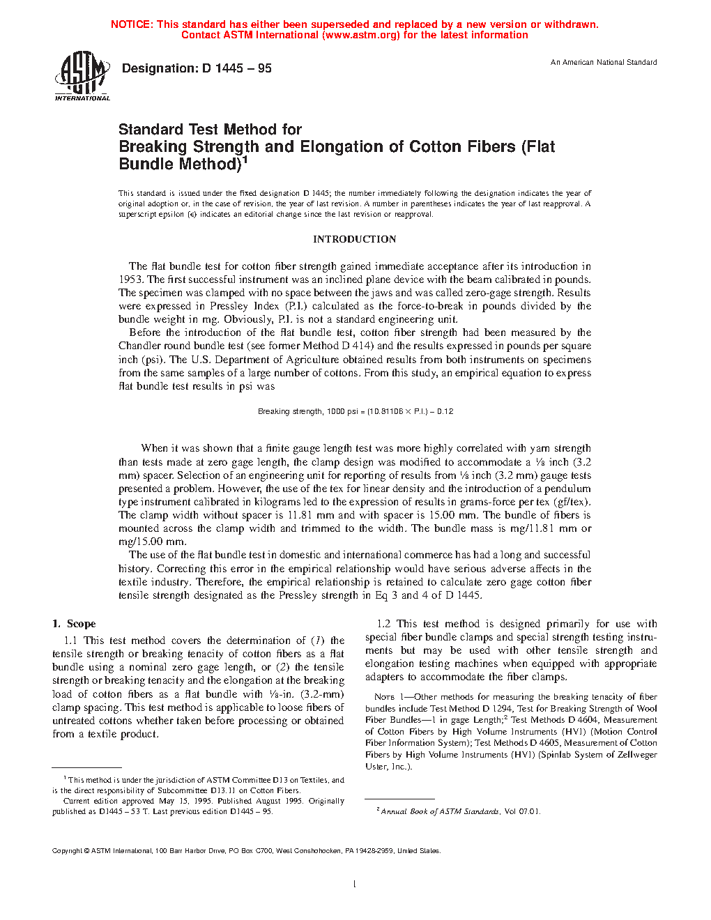 1.1 This test method covers the determination of (1) the tensile strength or breaking tenacity of cotton fibers as a flat bundle using a nominal zero gage length, or ( 2) the tensile strength or breaking tenacity and the elongation at the breaking load of cotton fibers as a flat bundle with 1/8-in. (3.2-mm) clamp spacing. This test method is applicable to loose fibers of untreated cottons whether taken before processing or obtained from a textile product.