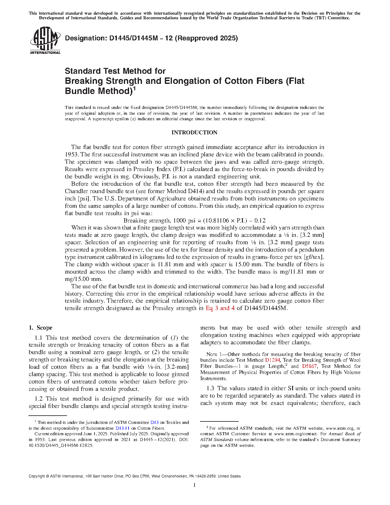 Note 1: Other methods for measuring the breaking tenacity of fiber bundles include Test Method D1294, Test for Breaking Strength of Wool Fiber Bundles—1 in gauge Length;2 and D5867, Test Method for Measurement of Physical Properties of Cotton Fibers by High Volume Instruments.