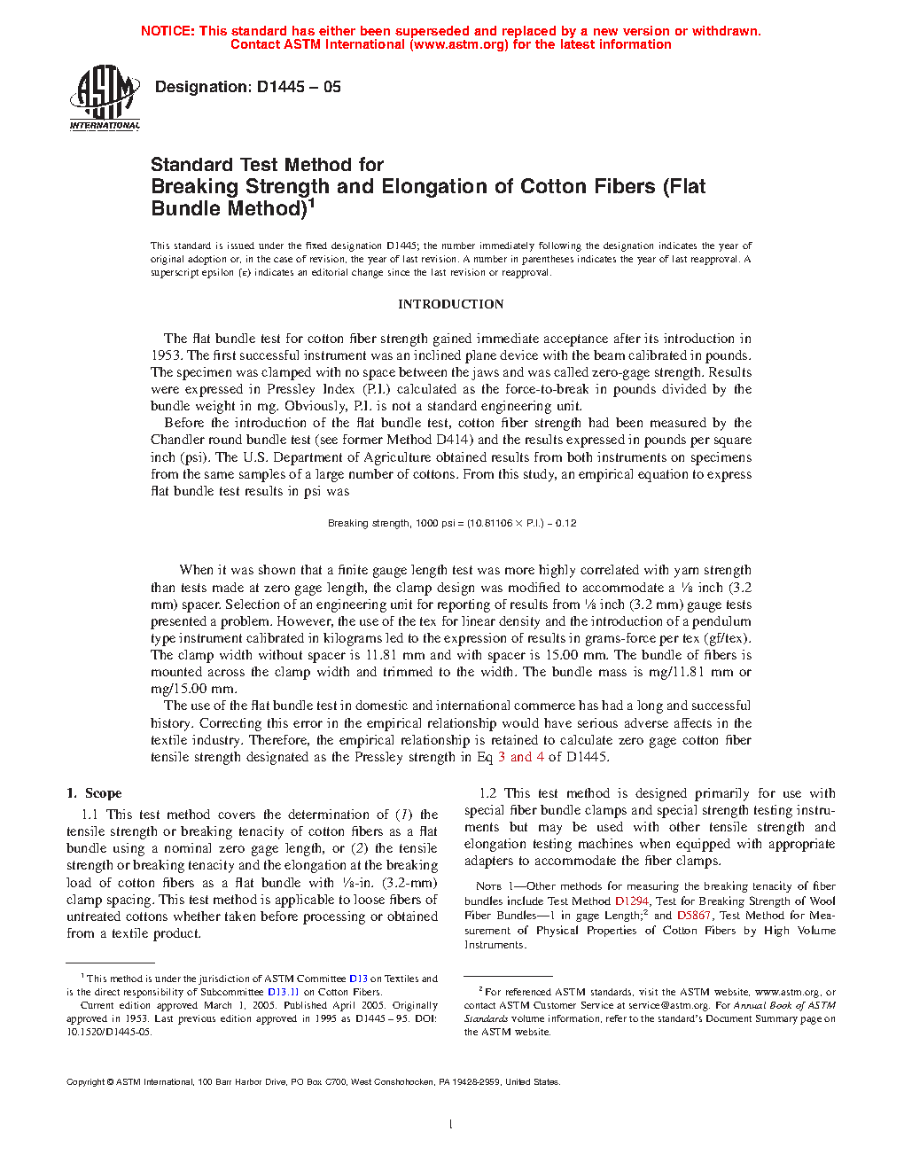 Note 1—Other methods for measuring the breaking tenacity of fiber bundles include Test Method D1294, Test for Breaking Strength of Wool Fiber Bundles